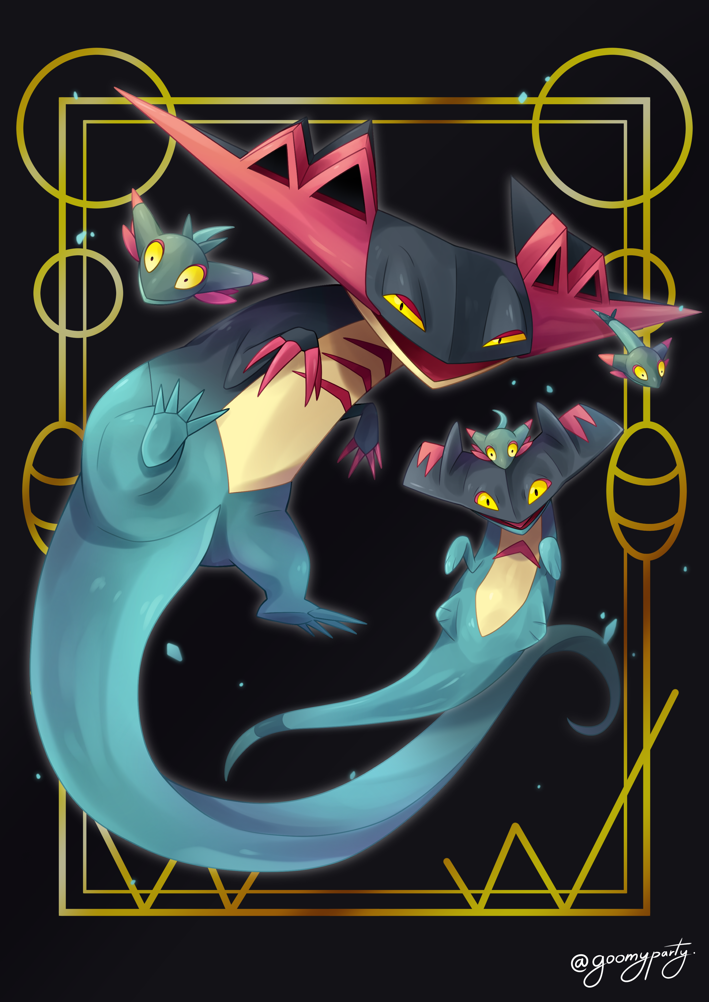 absurdres black_background commentary_request dragapult drakloak dreepy gen_8_pokemon goom_(goomyparty) half-closed_eyes highres looking_at_viewer nintendo no_humans open_mouth pokemon pokemon_(creature) twitter_username yellow_eyes