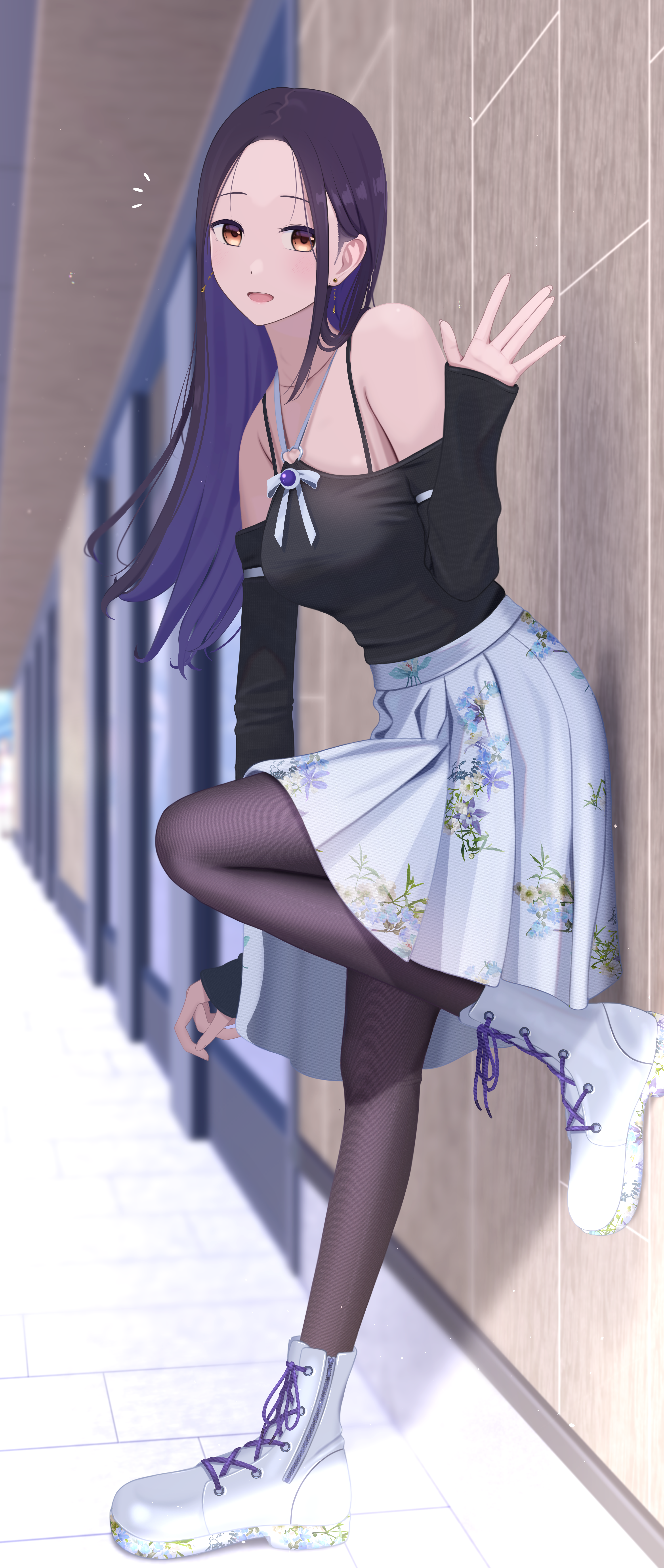1girl absurdres black_pantyhose black_shirt boots breasts brown_eyes collarbone earrings full_body highres inaka_44 jewelry long_hair looking_at_viewer medium_breasts off-shoulder_shirt off_shoulder open_mouth original outdoors paid_reward_available pantyhose pleated_skirt purple_hair shirt sidelocks skirt sleeves_past_wrists solo waving white_boots white_skirt