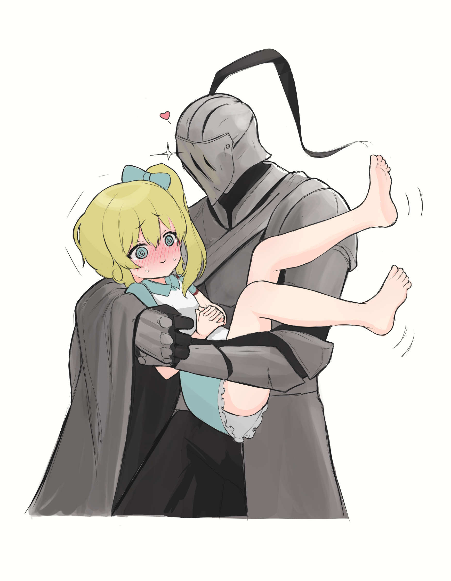 1boy 1girl @_@ armor barefoot black_souls blue_bow blue_dress blue_eyes blush bow breastplate cape carrying carrying_person commentary dress embarrassed english_commentary feet full-face_blush gauntlets grey_cape grimm_(black_souls) hair_bow heart helm helmet highres knight nervous_sweating own_hands_clasped own_hands_together princess_carry serpent_god_(black_souls) side_ponytail simple_background smile sparkle sunggou sweat white_background