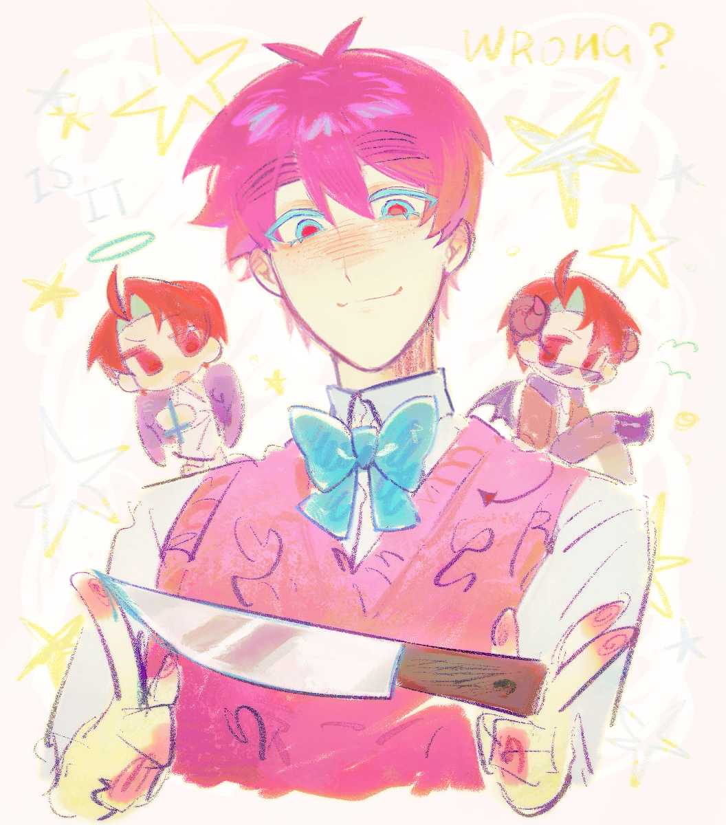 3boys alternate_eye_color alternate_hair_color america_(hetalia) angel angel_and_devil angel_wings axis_powers_hetalia blue_bow blue_bowtie blue_eyes boots bow bowtie brown_jacket chibi chinese_commentary closed_mouth collared_shirt colored_eyelashes commentary_request demon_wings english_text grey_pants hair_between_eyes halo highres holding holding_knife horns jacket knife male_focus mini_person miniboy multiple_boys open_clothes open_jacket open_mouth pants pink_hair pink_sweater purple-tinted_eyewear purple_boots purple_wings red_eyes red_hair red_pupils shirt shoulder_angel shoulder_devil siyuyuan82128 smile sunglasses sweater tinted_eyewear united_kingdom_(hetalia) white_shirt wings