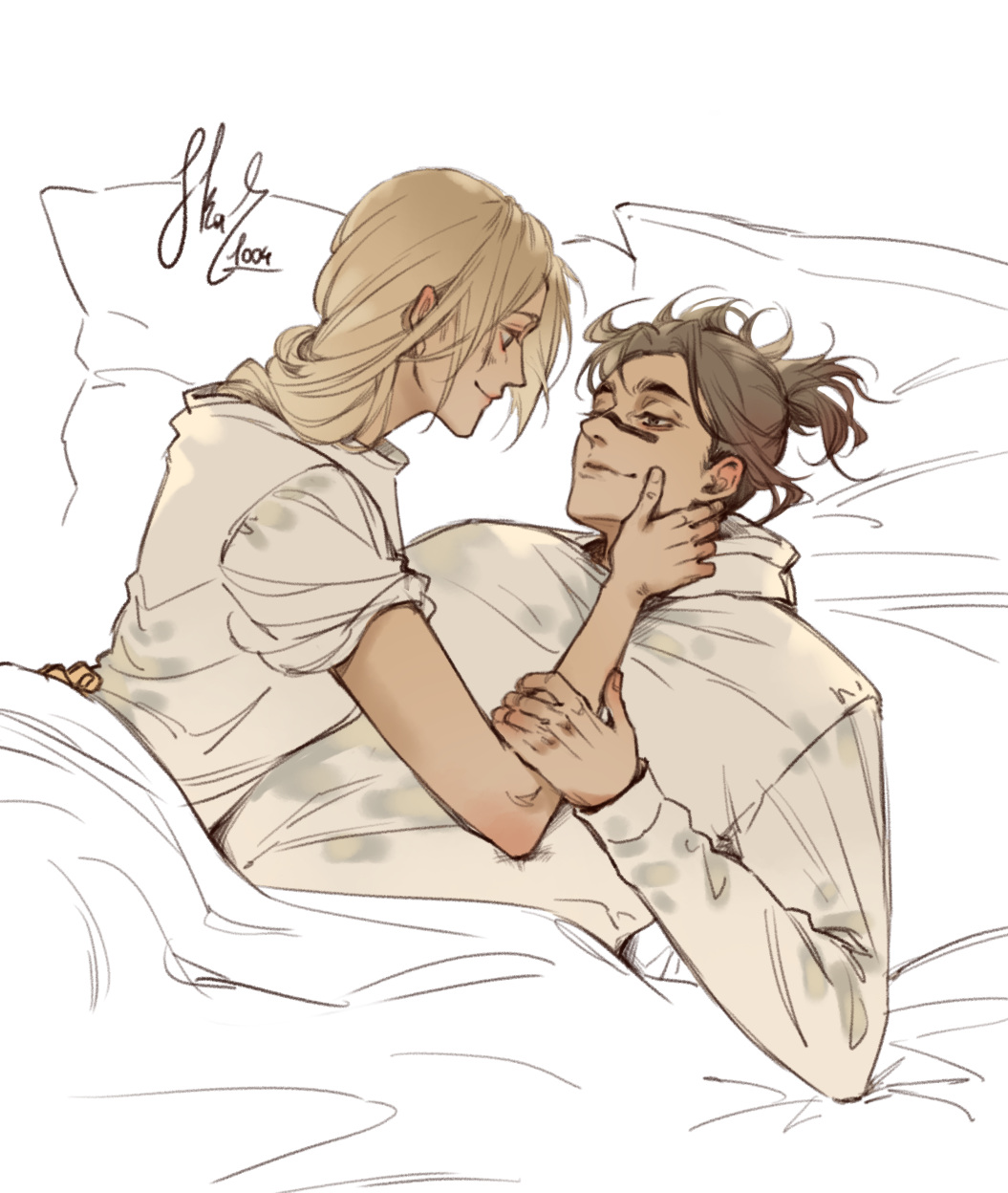 1boy 1girl blonde_hair choso_(jujutsu_kaisen) commentary english_commentary eye_contact highres jujutsu_kaisen long_hair looking_at_another lying on_back on_bed shirt signature skar_1004 smile tsukumo_yuki_(jujutsu_kaisen) twintails white_shirt