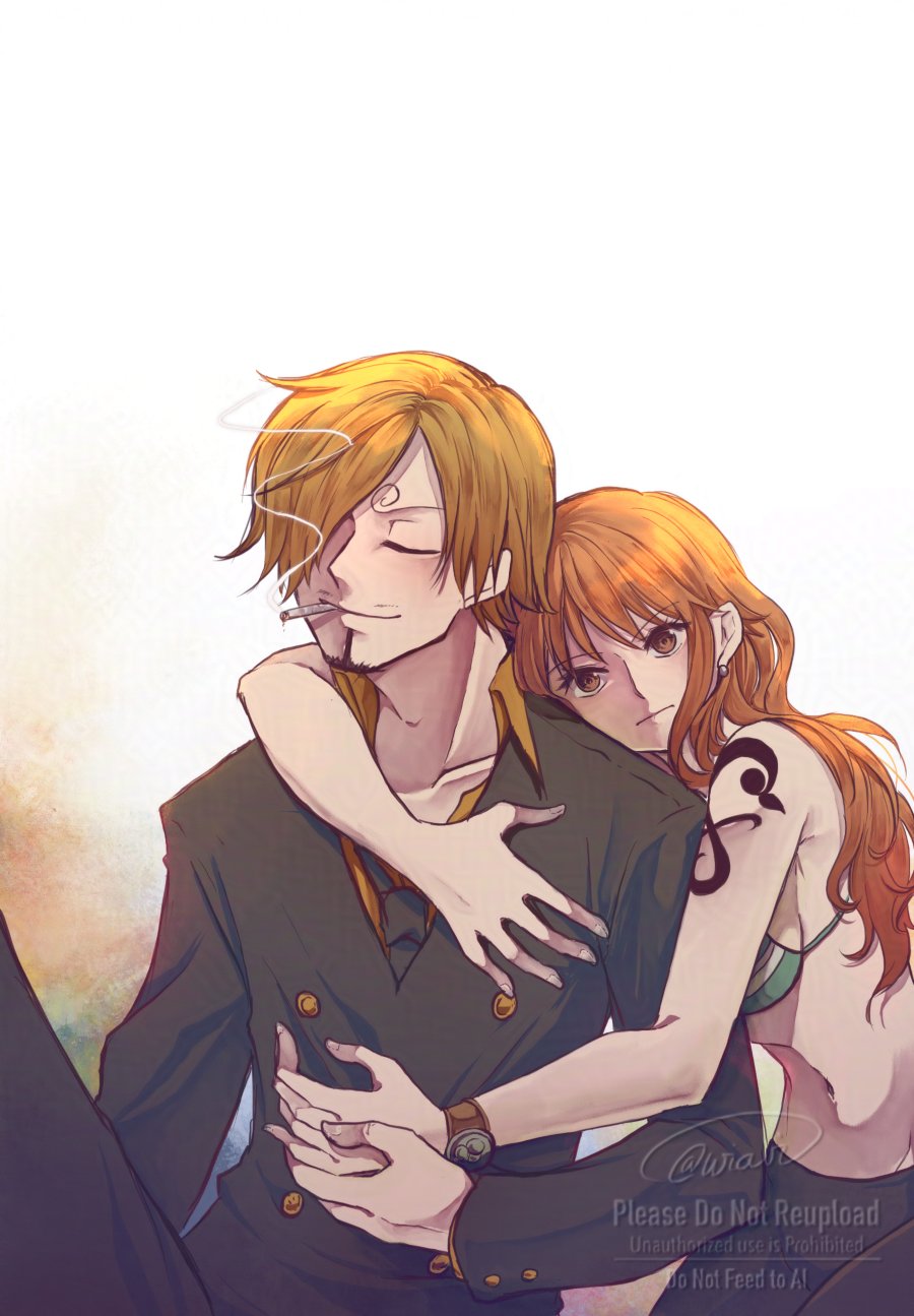 1boy 1girl artist_name bikini bikini_top_only blonde_hair cigarette closed_eyes collarbone collared_shirt curly_eyebrows formal_clothes hair_over_one_eye highres holding_hands hug hug_from_behind long_hair nami_(one_piece) nami_(one_piece)_(return_to_sabaody) one-piece_swimsuit one_piece orange_hair sanji_(one_piece) shirt signature simple_background smoking striped_bikini striped_clothes suit swimsuit twitter_username watermark white_background wia_vi yellow_shirt