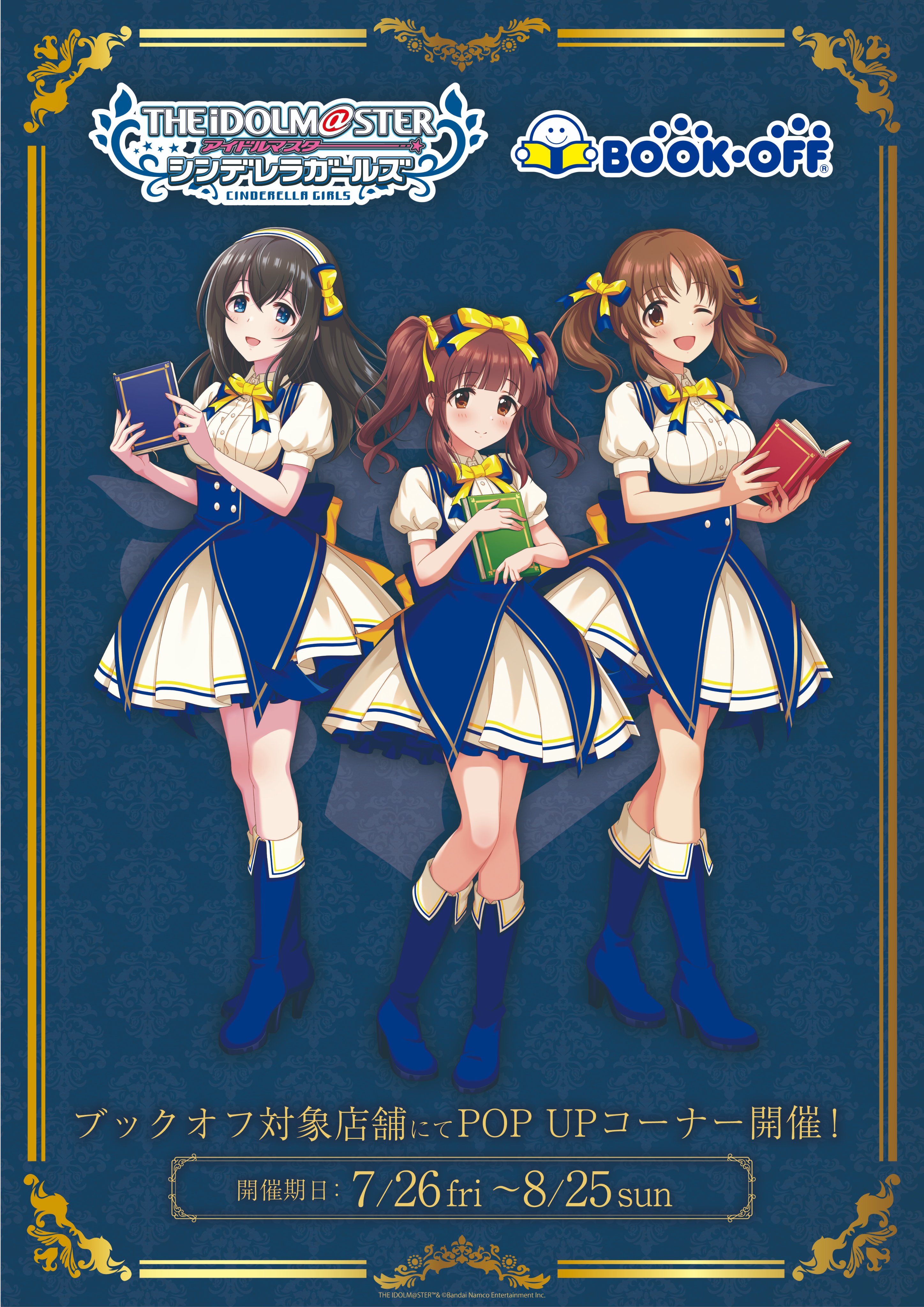 3girls absurdres blue_eyes book book_off boots brown_eyes brown_hair buttons english_text hairband high_heel_boots high_heels highres holding idol_clothes idolmaster idolmaster_cinderella_girls idolmaster_cinderella_girls_starlight_stage japanese_text multiple_girls official_art ogata_chieri promotional_art puffy_sleeves red_eyes red_hair sagisawa_fumika smiley_face totoki_airi twintails