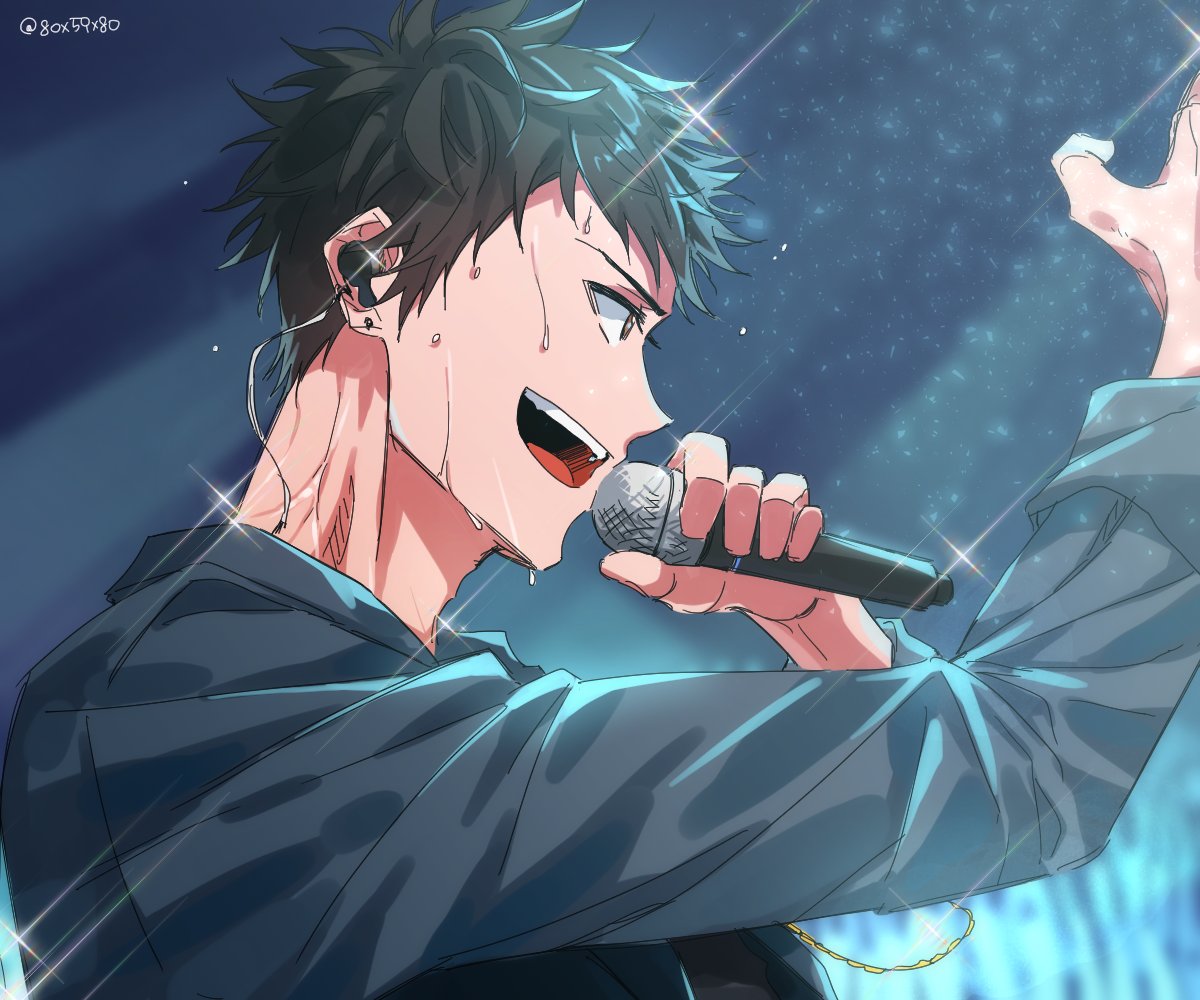 1boy 80x59x80 arm_up black_hair black_shirt brown_eyes commentary_request earpiece holding holding_microphone katekyo_hitman_reborn! long_sleeves looking_ahead male_focus microphone profile shirt short_hair sideways_mouth sleeve_cuffs solo sparkle sweat teeth tongue twitter_username upper_body upper_teeth_only very_sweaty yamamoto_takeshi