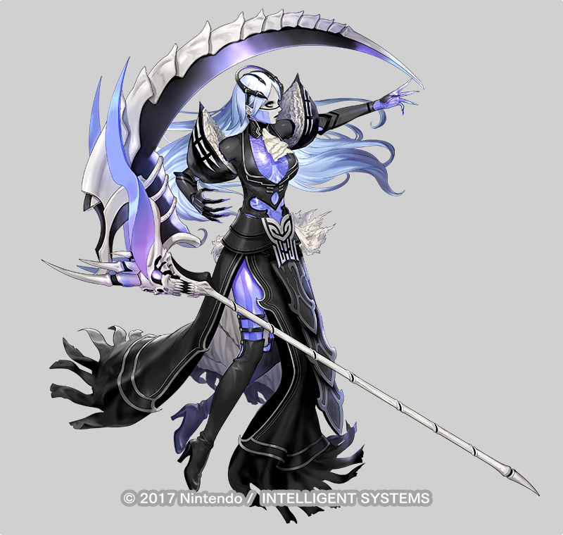 1girl asatani_tomoyo ascot black_dress black_eyeshadow black_lips bone boots breasts closed_mouth dress elbow_gloves eyeshadow fingernails fire_emblem fire_emblem_heroes ganglot_(fire_emblem) gloves gradient_hair green_eyes grey_background high_heel_boots high_heels jewelry knee_boots lips long_dress long_hair makeup medium_breasts multicolored_hair nintendo official_art scythe see-through_body see-through_clothes side_slit simple_background skeleton solo thigh_boots tiara weapon white_hair
