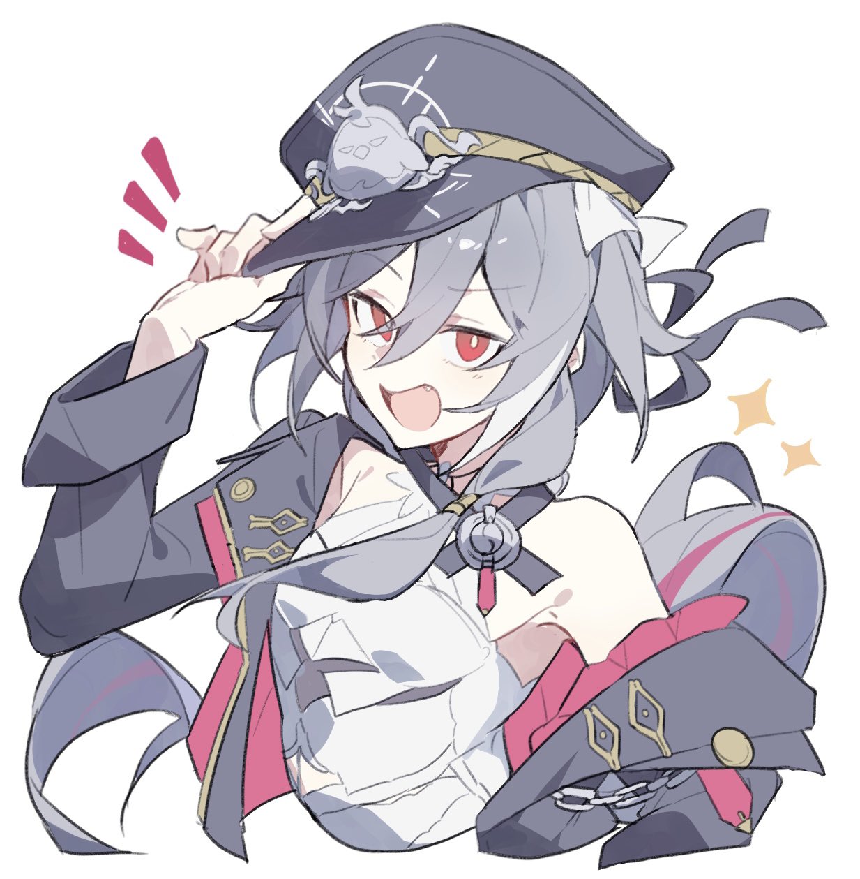 1girl arm_up black_hat black_jacket commentary_request cropped_torso dress fang grey_hair hair_between_eyes hand_on_headwear hat herrscher_of_sentience herrscher_of_sentience_(turn_up_the_music!) highres honkai_(series) honkai_impact_3rd jacket long_hair long_sleeves looking_at_viewer nonaa4141 notice_lines off_shoulder open_clothes open_jacket open_mouth peaked_cap red_eyes simple_background sleeveless sleeveless_dress solo sparkle upper_body very_long_hair white_background white_dress