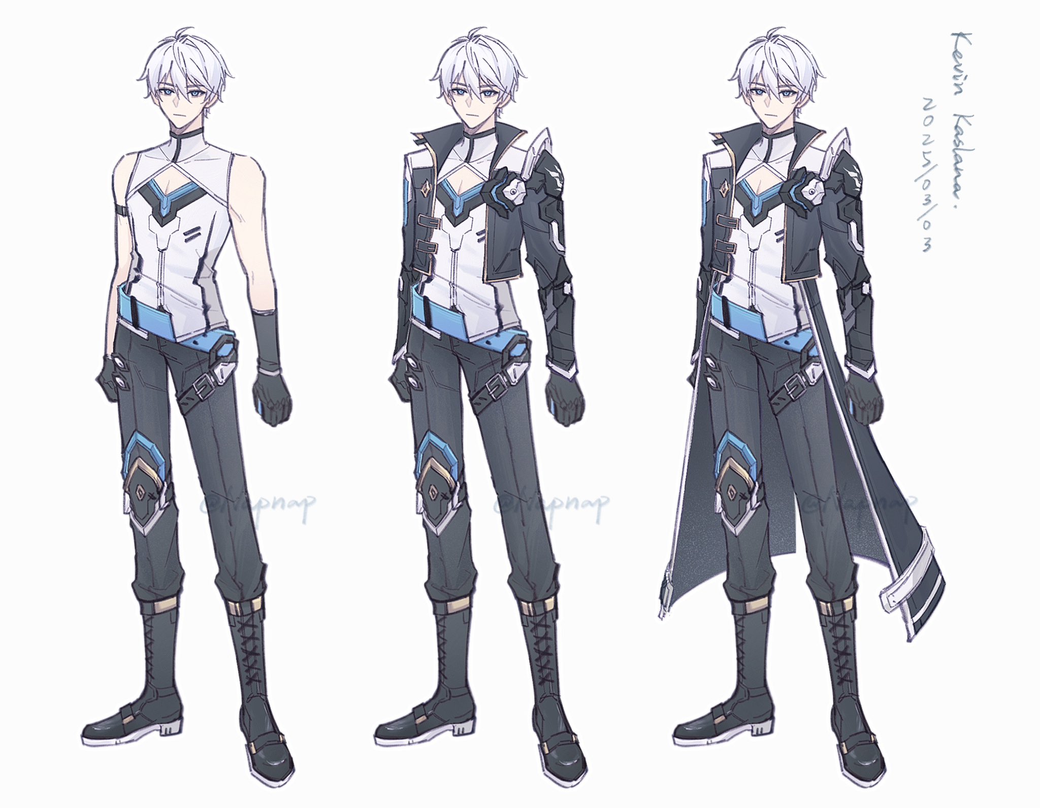 1boy ahoge bare_shoulders black_boots black_gloves black_jacket black_pants blue_eyes boots character_name cleavage_cutout clothing_cutout commentary cropped_jacket dated gloves grey_background grey_hair hair_between_eyes highres honkai_(series) honkai_impact_3rd jacket kevin_kaslana lace-up_boots long_sleeves looking_at_viewer male_focus multiple_views napppptt open_clothes open_jacket pants shirt simple_background single_hair_intake sleeveless sleeveless_shirt standing white_shirt