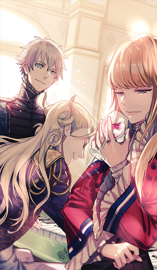 1other 2boys alcohol androgynous bishounen black_jacket blonde_hair blue_eyes blue_jacket charles-henri_sanson_(fate) charles-henri_sanson_(salon_de_marie)_(fate) chevalier_d'eon_(fate) chevalier_d'eon_(salon_de_marie)_(fate) closed_eyes commentary cowboy_shot cup drinking_glass fate/grand_order fate_(series) frills high_collar holding holding_cup instrument jacket light_smile long_hair male_focus multiple_boys music official_art pants piano playing_instrument playing_piano red_jacket short_hair sidelocks sitting standing sunlight third-party_source white_hair white_pants wine wine_glass wolfgang_amadeus_mozart_(fate) wolfgang_amadeus_mozart_(salon_de_marie)_(fate) yukihiro_utako