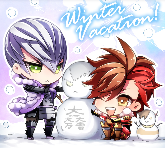 2boys :< :d brown_hair character_snowman chibi chibi_only fur_trim green_eyes grey_hair ishida_mitsunari_(sengoku_basara) kkkaaaayyy male_focus multicolored_hair multiple_boys one_eye_closed open_mouth red_hair sengoku_basara shima_sakon_(sengoku_basara) short_hair sitting smile snow snowing snowman standing two-tone_hair winter yellow_eyes