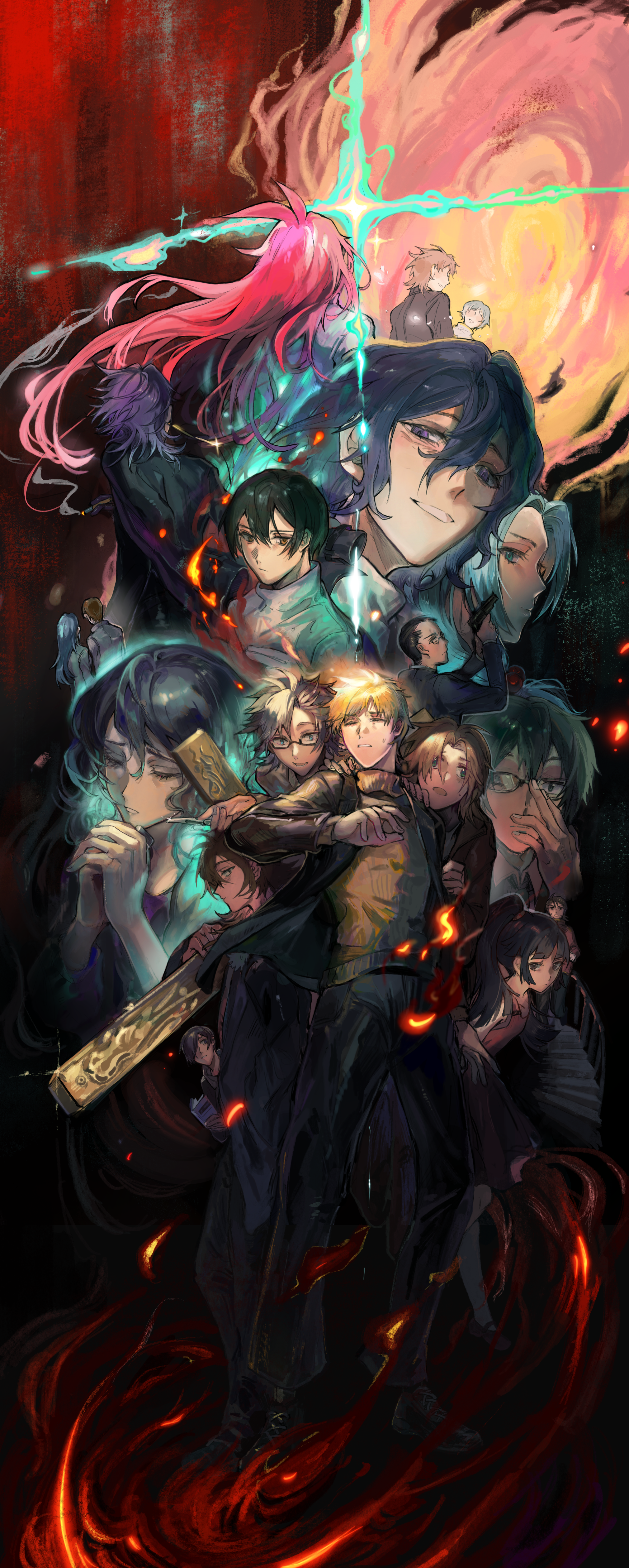 5girls 6+boys absurdres adjusting_eyewear aiba_ibuki alternate_eye_color alternate_hair_color antenna_hair aqua_eyes atou_haruki black_hair black_jacket black_pants black_shoes blonde_hair blue_eyes blue_hair brown_eyes brown_hair brown_sweater chinese_commentary cigarette closed_eyes commentary_request crescent_(crescent979) curtained_hair dress earrings enomoto_george enomoto_kazue enomoto_noa everyone glasses glint green_eyes green_hair grey_hair grey_jacket grin gun hair_between_eyes hair_over_one_eye handgun harada_minoru hatsutori_hajime highres holding holding_cigarette holding_gun holding_scalpel holding_weapon isoi_rai isoi_reiji jabuchi_you jacket jacket_on_shoulders jewelry kanou_aogu kumazaki_karen kumazaki_riku kurachi_terumi lapels long_hair mary_janes medium_hair multiple_boys multiple_girls notched_lapels open_clothes open_jacket otowa_rui_(saibou_shinkyoku) pants parted_bangs pink_hair ponytail purple_eyes purple_hair purple_shirt red_dress saibou_shinkyoku scalpel shinano_eiji shirt shoes short_hair sleeveless sleeveless_dress smile smoke stairs sweat sweater theodore_riddle turtleneck turtleneck_sweater utsugi_noriyuki very_long_hair weapon white_shirt yanagi_nina