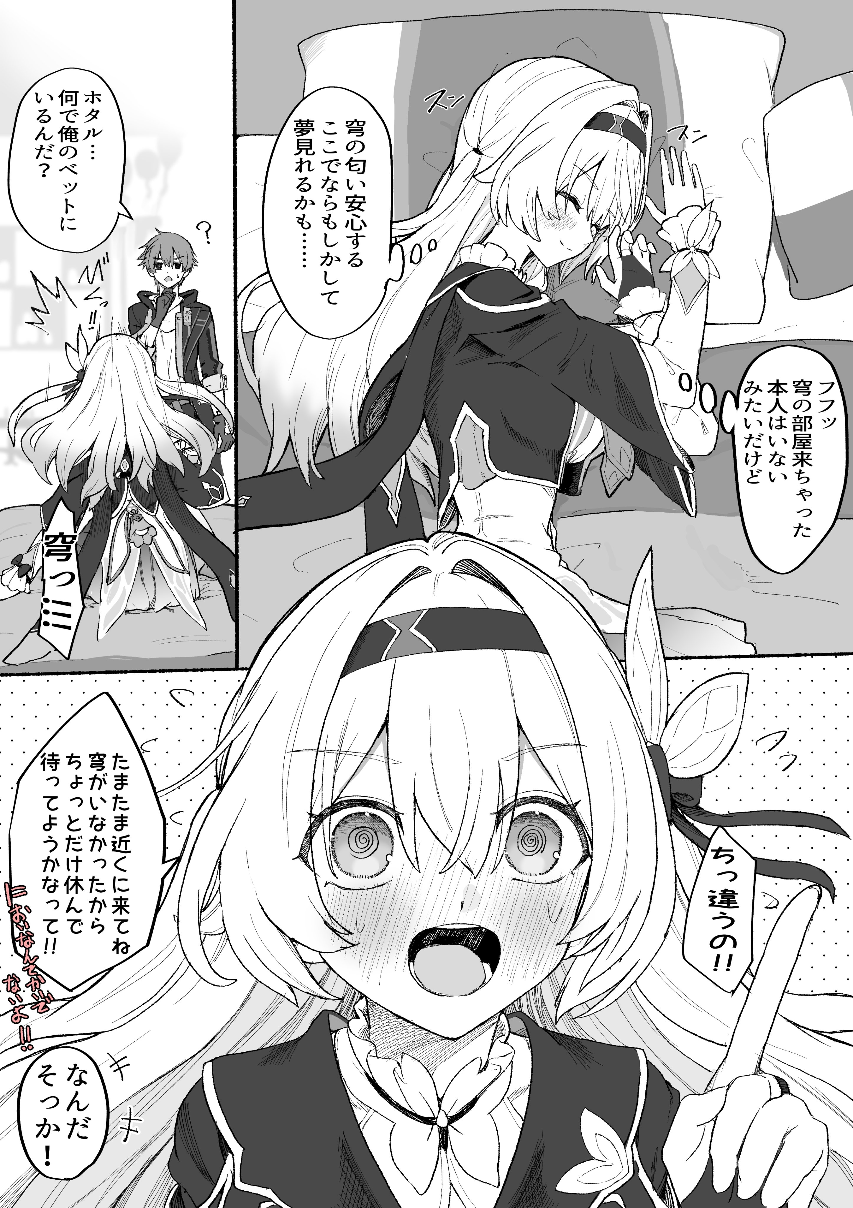 1boy 1girl @_@ absurdres blush bridal_gauntlets caelus_(honkai:_star_rail) cropped_jacket firefly_(honkai:_star_rail) hair_ornament hair_ribbon highres honkai:_star_rail honkai_(series) index_finger_raised lying neckerchief on_bed on_side pillow ribbon sei_(karupiza1490208) single_bridal_gauntlet speech_bubble sweatdrop thought_bubble trailblazer_(honkai:_star_rail)