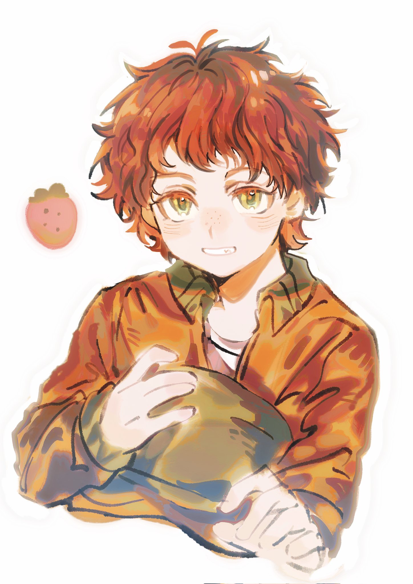 1boy animification bad_id bad_twitter_id cropped_torso fang food freckles fruit green_eyes grin hat highres holding holding_unworn_clothes holding_unworn_hat jacket kyle_broflovski long_sleeves male_focus orange_hair s3zwrtdyqaewnci short_hair smile solo south_park strawberry unworn_hat unworn_headwear