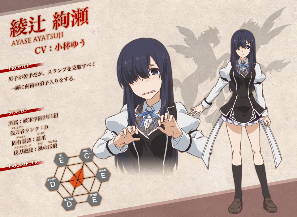 1girl ayatsuji_ayase black_dress black_eyes black_hair black_socks blue_ribbon blush breasts brown_shoes character_name character_profile closed_mouth collared_dress dress embarrassed frilled_skirt frills full_body hair_over_one_eye hands_up kneehighs long_hair long_sleeves looking_at_viewer multiple_views neck_ribbon official_art open_mouth puffy_long_sleeves puffy_sleeves rakudai_kishi_no_cavalry ribbon school_uniform shoes short_dress skirt skirt_under_dress smile socks standing tears translation_request white_sleeves wing_collar