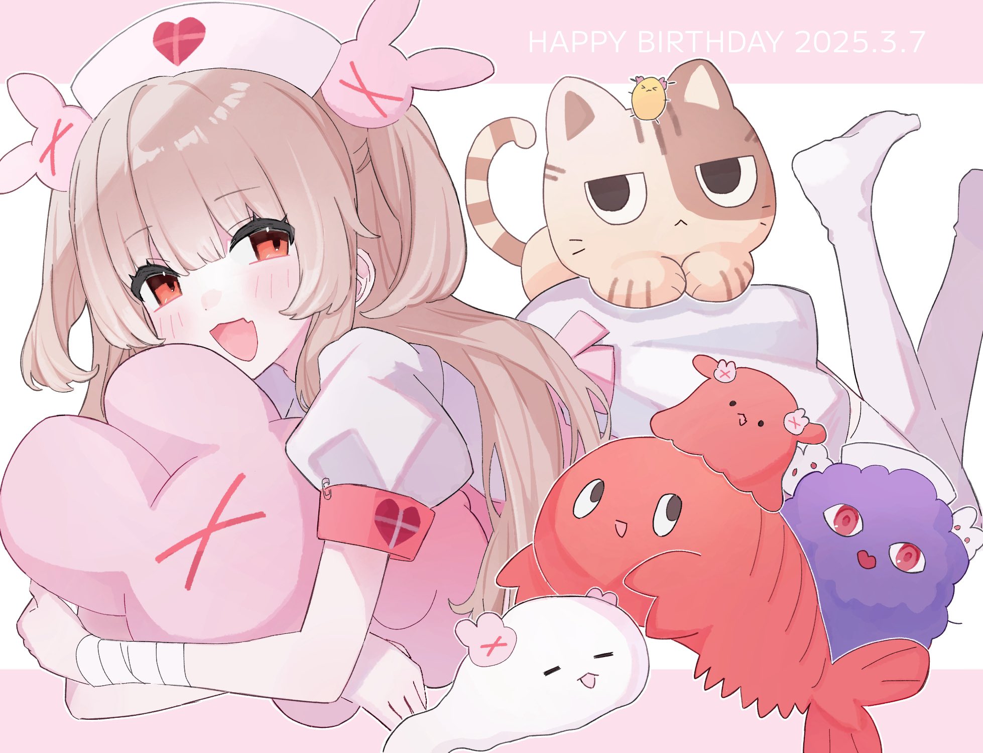 1girl :d apron bandaged_wrist bandages blush brown_hair cat commentary dated fang feet_up hair_ornament hanbun_choudai happy_birthday hashtag-only_commentary hat highres holding holding_stuffed_toy hugging_object long_hair looking_at_viewer lying natori_sana natori_sana_(nurse) no_shoes nurse_cap on_stomach open_mouth pink_apron pink_hat puffy_short_sleeves puffy_sleeves rabbit_hair_ornament red_eyes saana-kun sana_channel short_sleeves shrimp smile solo stuffed_animal stuffed_rabbit stuffed_toy the_pose two_side_up virtual_youtuber