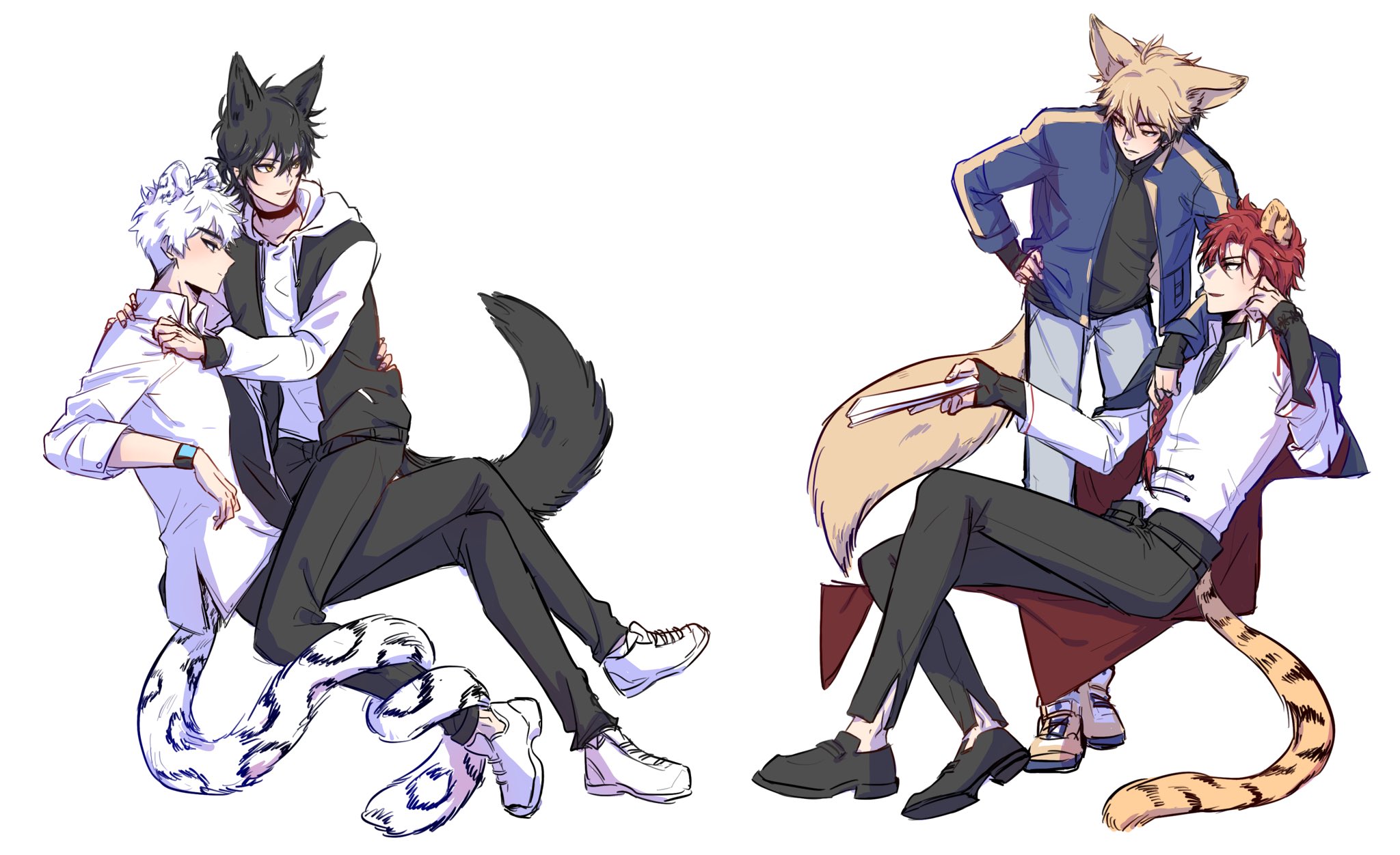 4boys animal_ears arm_around_shoulder black_gloves black_hair black_pants black_shirt black_vest blonde_hair blue_eyes blue_jacket cat_boy cheng_xiaoshi choker collar collared_shirt crossed_legs dog_boy dog_ears dog_tail fingerless_gloves fox_boy fox_ears fox_tail full_body gloves hair_between_eyes highres hood invisible_chair jacket kemonomimi_mode leaning_back leopard_ears leopard_tail long_sleeves looking_at_another lu_guang male_focus multiple_boys necktie open_clothes open_jacket pants red_eyes red_hair red_jacket shiguang_dailiren shirt shoes short_hair simple_background sitting smile sneakers spiked_hair tail tiger_boy tiger_ears tiger_tail vest watch white_background white_hair white_jacket white_pants white_shirt wristwatch xia_fei xiao_weiying yaoi yellow_eyes