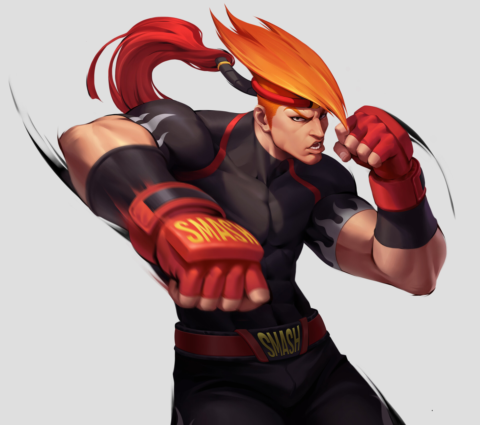 1boy adon_(street_fighter) belt black_pants black_shirt clenched_hands gauntlets highres impossible_hair line_of_action logo male_focus muscular official_alternate_costume official_art orange_hair pants punching shirt simple_background street_fighter street_fighter:_duel