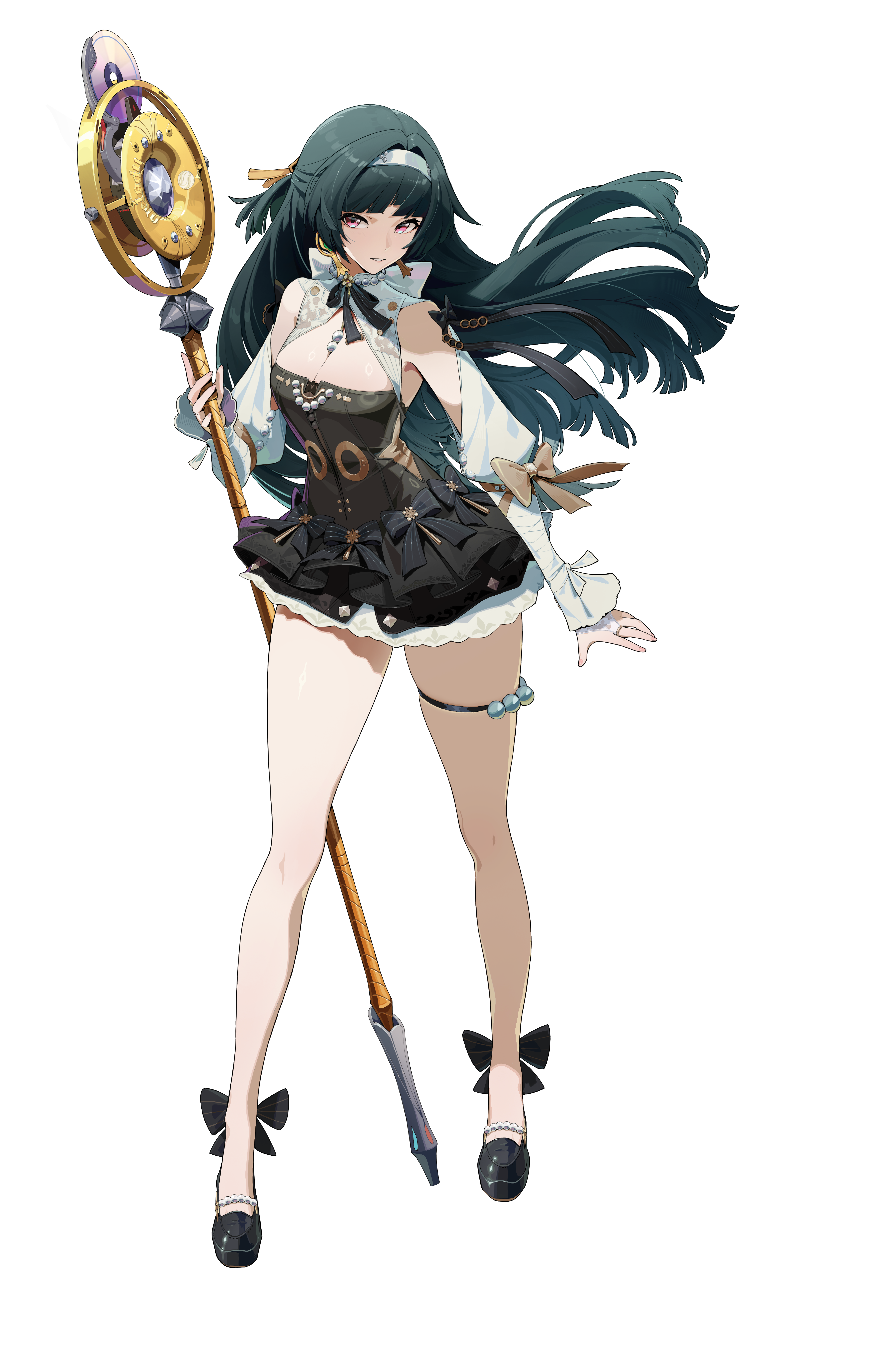 1girl absurdres astra_yao astra_yao_(chandelier) bare_legs black_dress black_hair blunt_bangs breasts cleavage detached_sleeves dress earrings full_body hair_ornament hairband highres holding holding_staff holding_weapon jewelry large_breasts long_hair long_sleeves looking_at_viewer necklace official_alternate_costume official_art pearl_necklace purple_eyes short_dress simple_background solo staff standing thigh_strap thighs transparent_background weapon white_hairband zenless_zone_zero