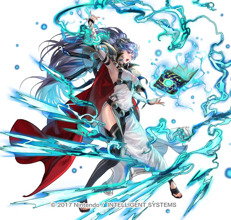 1girl alternate_costume arm_up armor armpits belt boots breasts cape cleavage copyright_notice dress earrings fire_emblem fire_emblem:_genealogy_of_the_holy_war fire_emblem_heroes floating floating_object full_body gold_trim hair_ornament ishtar_(fire_emblem) ishtar_(resplendent)_(fire_emblem) jewelry lightning long_dress long_hair long_sleeves magic medium_breasts nintendo official_art open_mouth ponytail purple_eyes purple_hair red_cape shiny_skin shoulder_armor side_slit suzuki_rika very_long_hair white_background white_dress