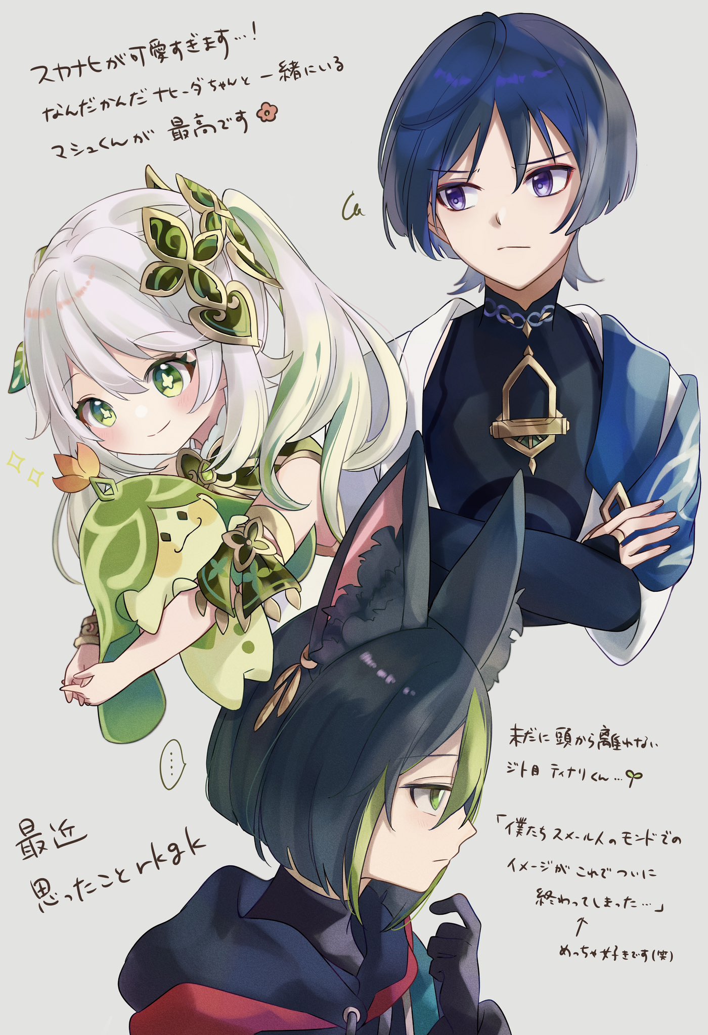 1girl 2boys animal_ear_fluff animal_ears aranara_(genshin_impact) armlet black_bodysuit black_bridal_gauntlets black_gloves black_hair black_hood blue_cape blunt_ends blush bodysuit bracelet bridal_gauntlets bright_pupils cape choppy_bangs closed_mouth colored_bangs creature cropped_torso cross-shaped_pupils crossed_arms curled_fingers detached_sleeves drawstring engasaki_sakura eyelashes eyeliner eyeshadow fingernails fox_ears genshin_impact gloves gold gold_ring green_eyes green_hair green_sleeves grey_background hair_between_eyes hair_ornament hand_up highres holding holding_creature hood hood_down interlocked_fingers japanese_clothes jewelry kimono leaf leaf_hair_ornament long_hair looking_at_creature looking_down looking_to_the_side makeup mandarin_collar middle_ring multicolored_hair multiple_boys nahida_(genshin_impact) open_clothes open_kimono own_hands_clasped own_hands_together pointing pointing_at_self purple_eyes purple_pupils red_eyeliner red_eyeshadow scaramouche_(genshin_impact) shoulder_peek side_ponytail sidelocks sideways_glance smile streaked_hair symbol-shaped_pupils tareme tighnari_(genshin_impact) translation_request tsurime wanderer_(genshin_impact) white_hair white_kimono white_pupils white_trim