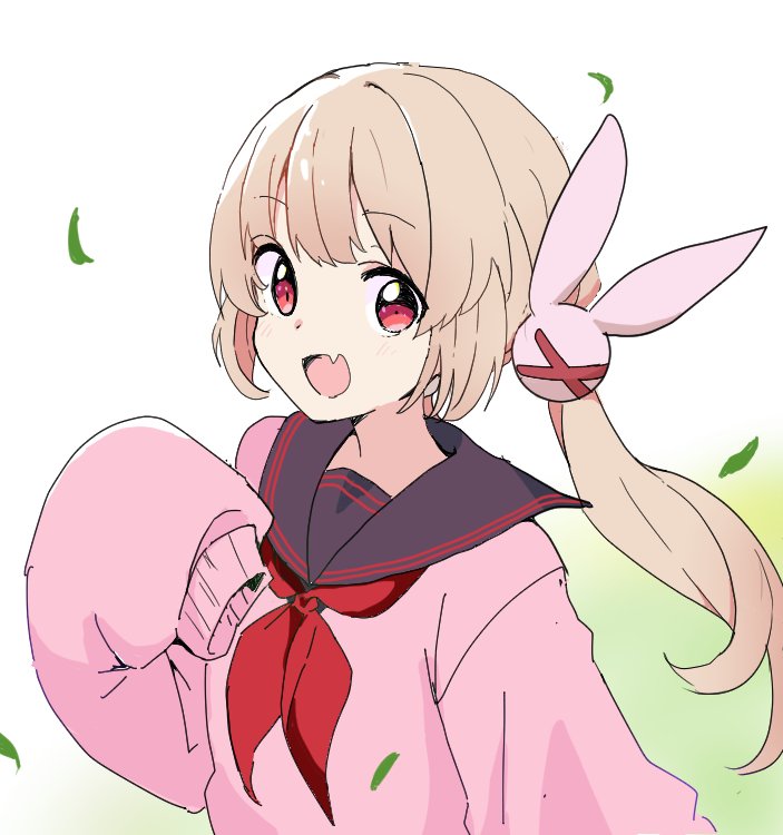 1girl :d black_sailor_collar blonde_hair commentary_request fang hair_ornament hand_up leaf long_hair long_sleeves looking_at_viewer low_ponytail natori_sana natori_sana_(school_uniform) neckerchief open_mouth ponytail rabbit_hair_ornament red_eyes red_neckerchief sailor_collar sana_channel sleeves_past_fingers sleeves_past_wrists smile solo upper_body virtual_youtuber white_background youasato