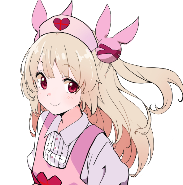 1girl apron blonde_hair closed_mouth commentary_request hair_ornament hat long_hair looking_at_viewer natori_sana natori_sana_(nurse) nurse_cap pink_apron pink_hat rabbit_hair_ornament red_eyes sana_channel simple_background smile solo two_side_up upper_body virtual_youtuber white_background youasato