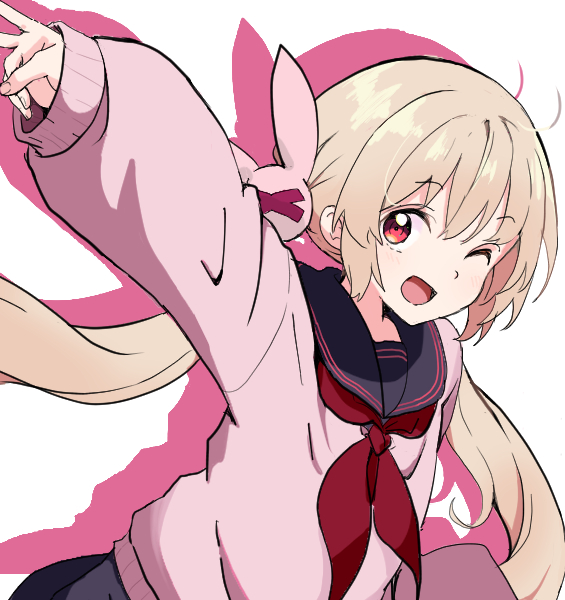 1girl ;d arm_up black_sailor_collar black_skirt commentary_request cowboy_shot drop_shadow hair_ornament long_hair long_sleeves looking_at_viewer low_twintails natori_sana natori_sana_(school_uniform) neckerchief one_eye_closed open_mouth outstretched_arm pink_sweater pleated_skirt rabbit_hair_ornament red_eyes red_neckerchief sailor_collar sana_channel skirt sleeves_past_wrists smile solo sweater twintails v virtual_youtuber youasato