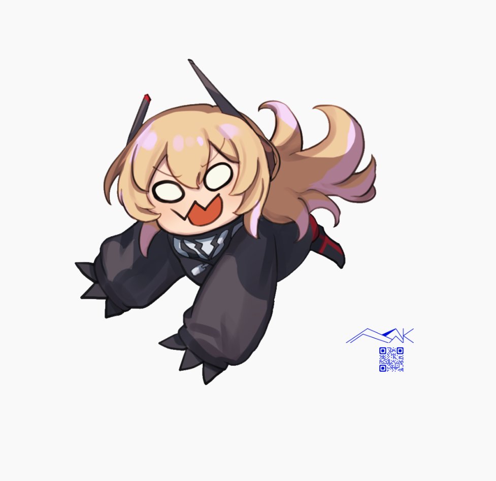 1girl black_jacket black_scarf blonde_hair chibi commentary english_commentary full_body girls'_frontline jacket long_hair long_sleeves looking_at_viewer m4_sopmod_ii_jr open_mouth scarf smile solo white_background yotsuyama_(yomo8ama)