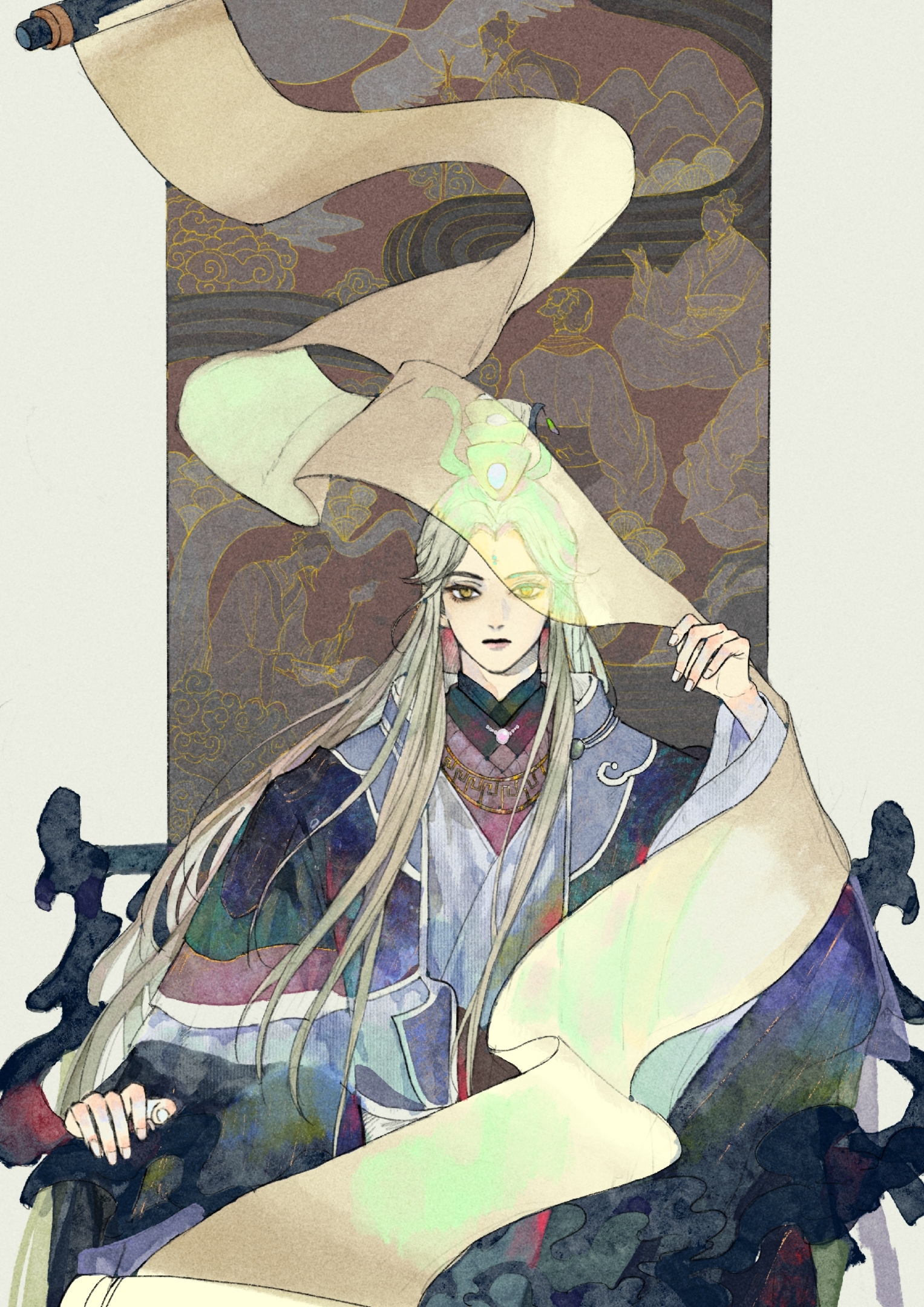 1boy 4k123 blonde_hair blue_hanfu chair chinese_clothes closed_mouth curtained_hair facial_mark green_hair hair_over_shoulder hanfu highres jewelry jinguang_budaixi long_hair long_sidelocks long_sleeves looking_at_viewer male_focus mo_cangli multicolored_hair multicolored_sleeves painting_(object) parted_bangs scroll sidelocks sitting solo straight-on upper_body white_background wide_sleeves xiao_guan_(headdress)