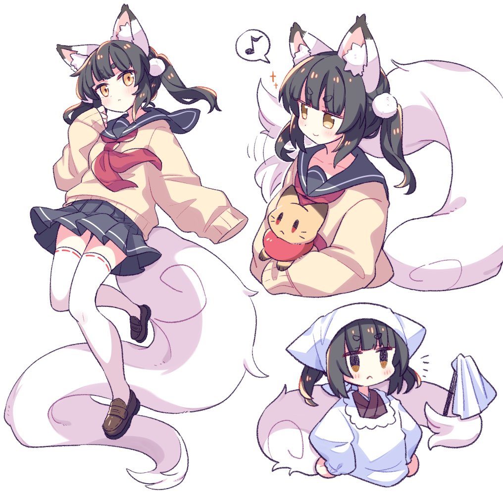 1girl animal animal_ear_fluff animal_ears animalization black_hair black_sailor_collar black_skirt blunt_bangs blush brown_cardigan brown_eyes brown_shoes cardigan collarbone duster eighth_note fox fox_ears fox_tail full_body holding holding_animal holding_with_tail jacket japanese_clothes kimono large_tail loafers long_sleeves multiple_views musical_note neckerchief original pleated_skirt pout prehensile_tail red_kimono red_neckerchief sailor_collar shoes short_twintails sidelocks simple_background skirt sleeves_past_fingers sleeves_past_wrists smile spoken_musical_note suzuno_(suzuno3110) tail thick_eyebrows thighhighs twintails white_background white_jacket white_thighhighs wind wind_lift