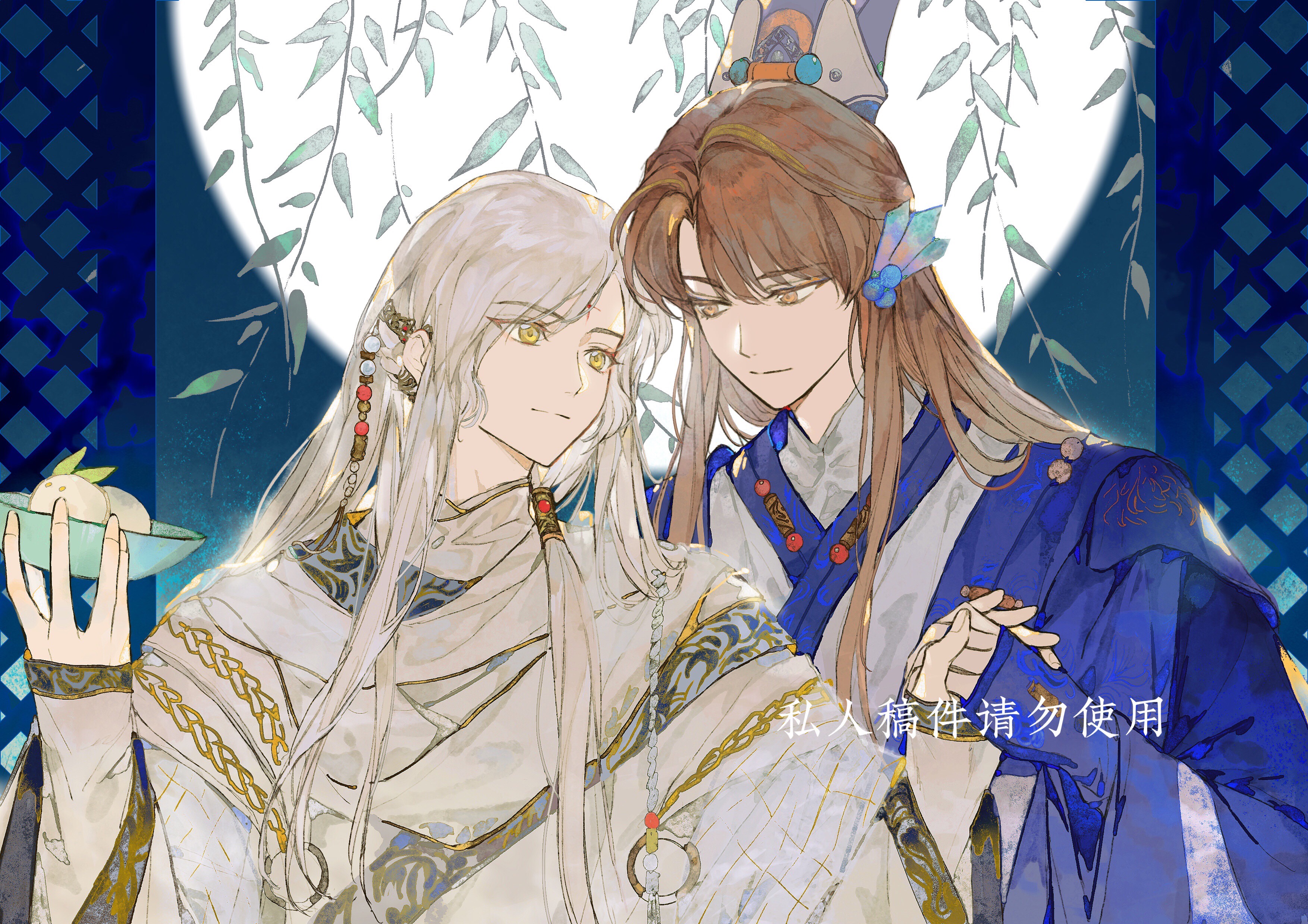 2boys 4k123 absurdres asymmetrical_bangs beads blue_hanfu blue_sleeves bowl brown_eyes brown_hair chinese_clothes chinese_text closed_mouth eye_contact facial_mark full_moon hair_ornament hanfu highres holding holding_bowl holding_hands huadian jinguang_budaixi layered_sleeves leaf long_sleeves looking_at_another male_focus moon multiple_boys night parted_bangs qiao_rulai upper_body white_hair white_hanfu white_sleeves wide_sleeves xiao_guan_(headdress) yan_hanqing yaoi yellow_eyes