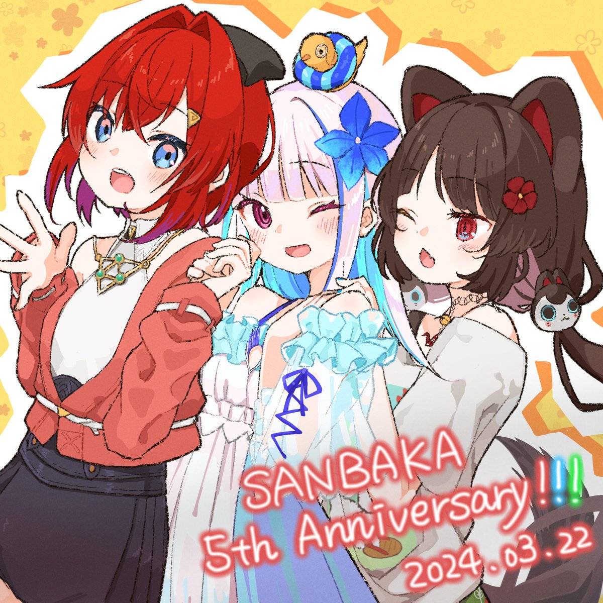 3girls :o ange_katrina ange_katrina_(summer_casual) animal animal_ears animal_hair_ornament animal_on_head anniversary belt bird bird_on_head black_bow black_skirt blue_eyes blue_flower blue_hair blue_nails blunt_bangs blush bow breasts brown_hair brown_tail choker collared_shirt colored_inner_hair commentary_request cowboy_shot dated detached_sleeves dog_ears dog_girl dog_tail dress english_text fang floral_background flower frilled_dress frilled_sleeves frills from_side gold_necklace group_name hair_bow hair_flower hair_intakes hair_ornament hand_on_another's_shoulder hand_on_own_shoulder hands_up high-waist_skirt highres holding_hands innertube inui_toko inui_toko_(summer_casual) jacket jewelry lace lace_choker lize_helesta lize_helesta_(2nd_costume) long_hair long_sleeves looking_at_another looking_at_viewer low_twintails monocle multicolored_hair multiple_girls nail_polish necklace nijisanji off-shoulder_shirt off_shoulder on_head one_eye_closed open_mouth outline pendant_choker print_shirt purple_eyes red_eyes red_flower red_hair red_jacket sanbaka_(nijisanji) sebastian_piyodore shirt short_hair sidelocks skin_fang skirt sleeveless sleeveless_dress sleeveless_shirt small_breasts smile streaked_hair swim_ring tail teeth triangle_hair_ornament twintails upper_teeth_only virtual_youtuber white_belt white_dress white_hair white_outline white_shirt white_sleeves yellow_background yellow_bird yuzuki_(yuduame)