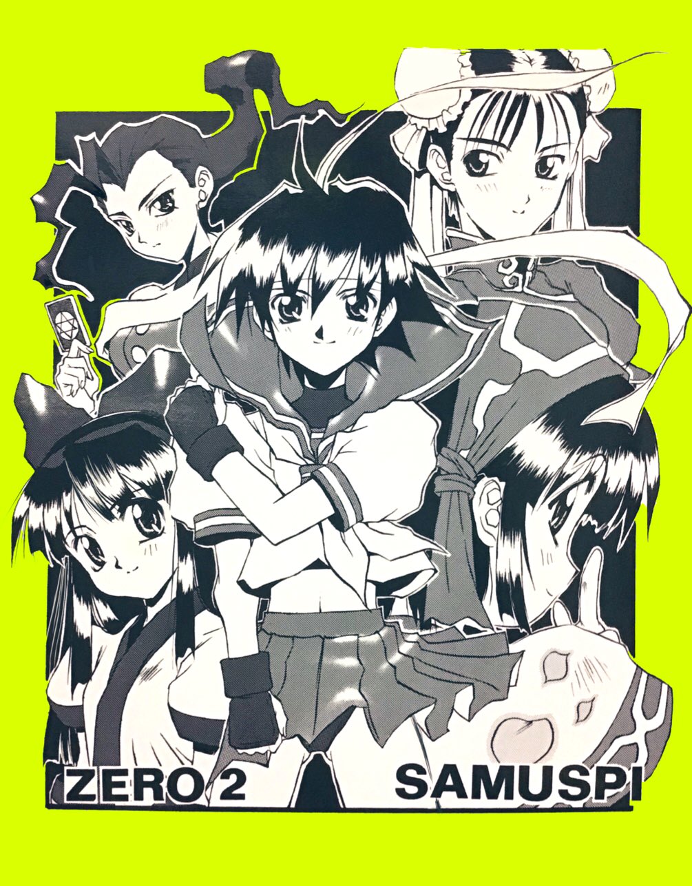 5girls ahoge ainu_clothes black_hair breasts capcom card cherry_blossoms chinese_clothes chun-li crossover double_bun english_text fingerless_gloves forehead gloves hair_bun hair_ribbon headband highres hisashi_kadota kasugano_sakura large_breasts legs long_hair looking_at_viewer looking_back mature_female midriff monochrome multiple_girls nakoruru navel ribbon rimururu rose_(street_fighter) samurai_spirits school_uniform short_hair siblings sisters skirt smile snk street_fighter tarot the_king_of_fighters thighs