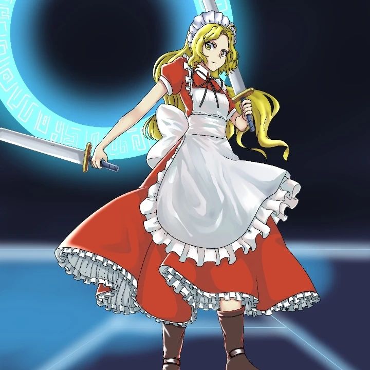 1girl apron blonde_hair bow dress kyoto_art_project long_hair maid maid_headdress makai_(touhou) multiple_swords mystic_square open_mouth puffy_short_sleeves puffy_sleeves red_dress ribbon short_sleeves solo sword touhou touhou_(pc-98) weapon yellow_eyes yumeko_(touhou)
