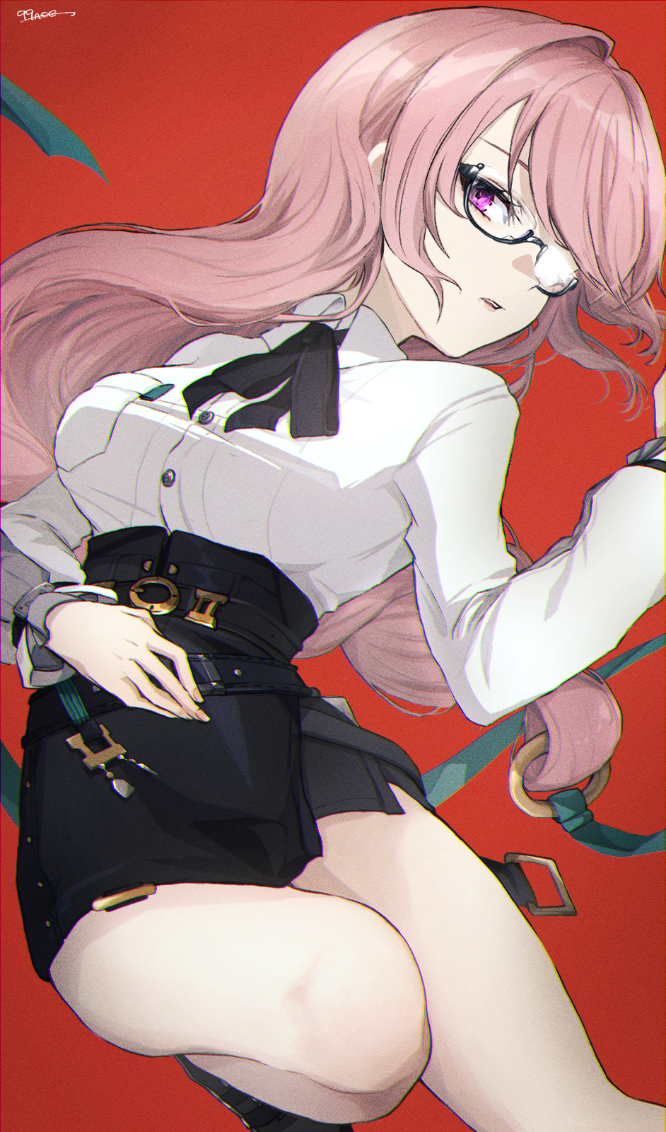1girl 99noe_honoka arched_back black_skirt breasts facing_to_the_side glasses highres large_breasts long_hair looking_at_viewer on_floor pencil_skirt pink_eyes pink_hair red_background shirt skirt solo thighs tsukishiro_yanagi very_long_hair white_shirt zenless_zone_zero