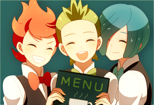 3boys black_vest blue_background blue_bow blue_bowtie blue_hair bow bowtie brothers chili_(pokemon) cress_(pokemon) facing_viewer green_bow green_bowtie green_hair hair_over_one_eye happy himari_g_(sr) lowres male_focus multiple_boys nintendo open_mouth pokemon pokemon_black_and_white red_bow red_bowtie red_hair shirt siblings triplets vest white_shirt