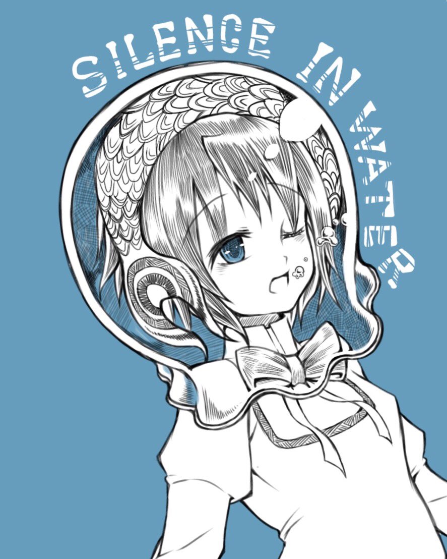 1girl air_bubble blue_background blue_eyes breasts bubble commentary_request crosshatching english_text fish hatching_(texture) helmet juliet_sleeves limited_palette long_sleeves mahou_shoujo_madoka_magica miki_sayaka mitakihara_school_uniform one-hour_drawing_challenge one_eye_closed open_mouth puffy_sleeves school_uniform short_hair small_breasts solo tsuno_(ikkakusu) upper_body