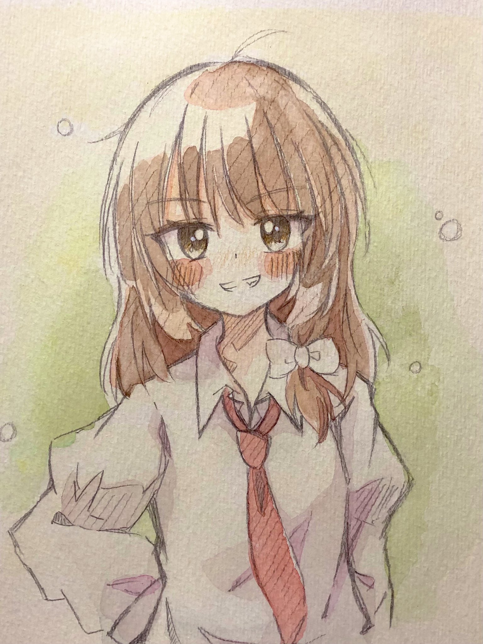 1girl blush bow brown_eyes brown_hair collared_shirt commentary_request grin hair_bow highres long_hair long_sleeves looking_at_viewer necktie missing_headwear painting_(medium) red_necktie shirt smile solo touhou traditional_media usami_renko watercolor_(medium) white_bow white_shirt zeppachi