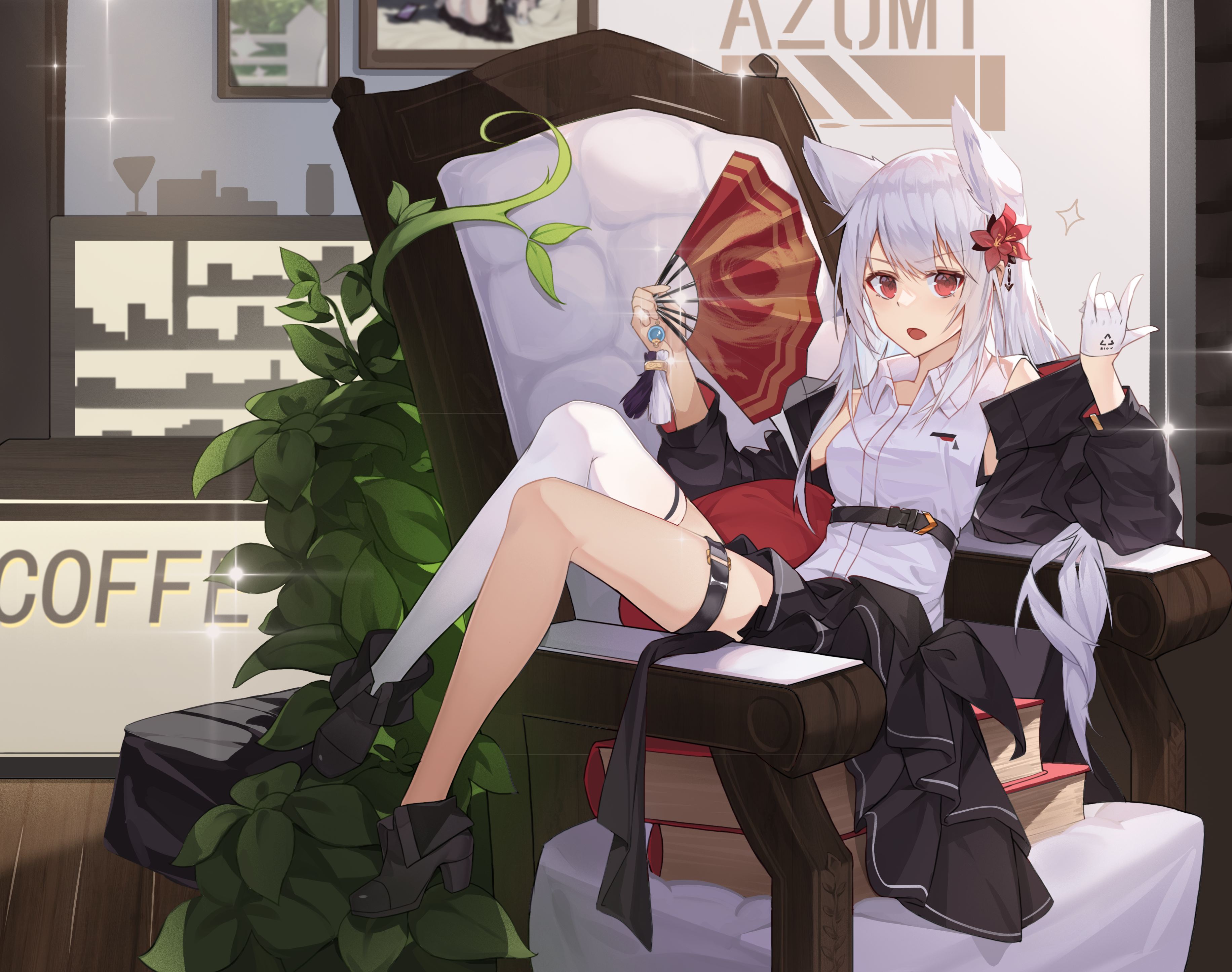 1girl absurdres animal_ear_fluff animal_ears artist_name azumi_(8809464) belt black_boots black_jacket black_skirt book book_stack boots chair commentary commentary_request english_commentary flower folding_fan fox_ears fox_girl full_body gloves hair_flower hair_ornament hand_fan highres holding holding_fan indoors jacket long_hair looking_at_viewer off_shoulder open_mouth original plant pleated_skirt red_eyes shirt single_glove single_thighhigh sitting sitting_on_books skirt sleeveless sleeveless_shirt solo thigh_strap thighhighs white_gloves white_hair white_shirt white_thighhighs