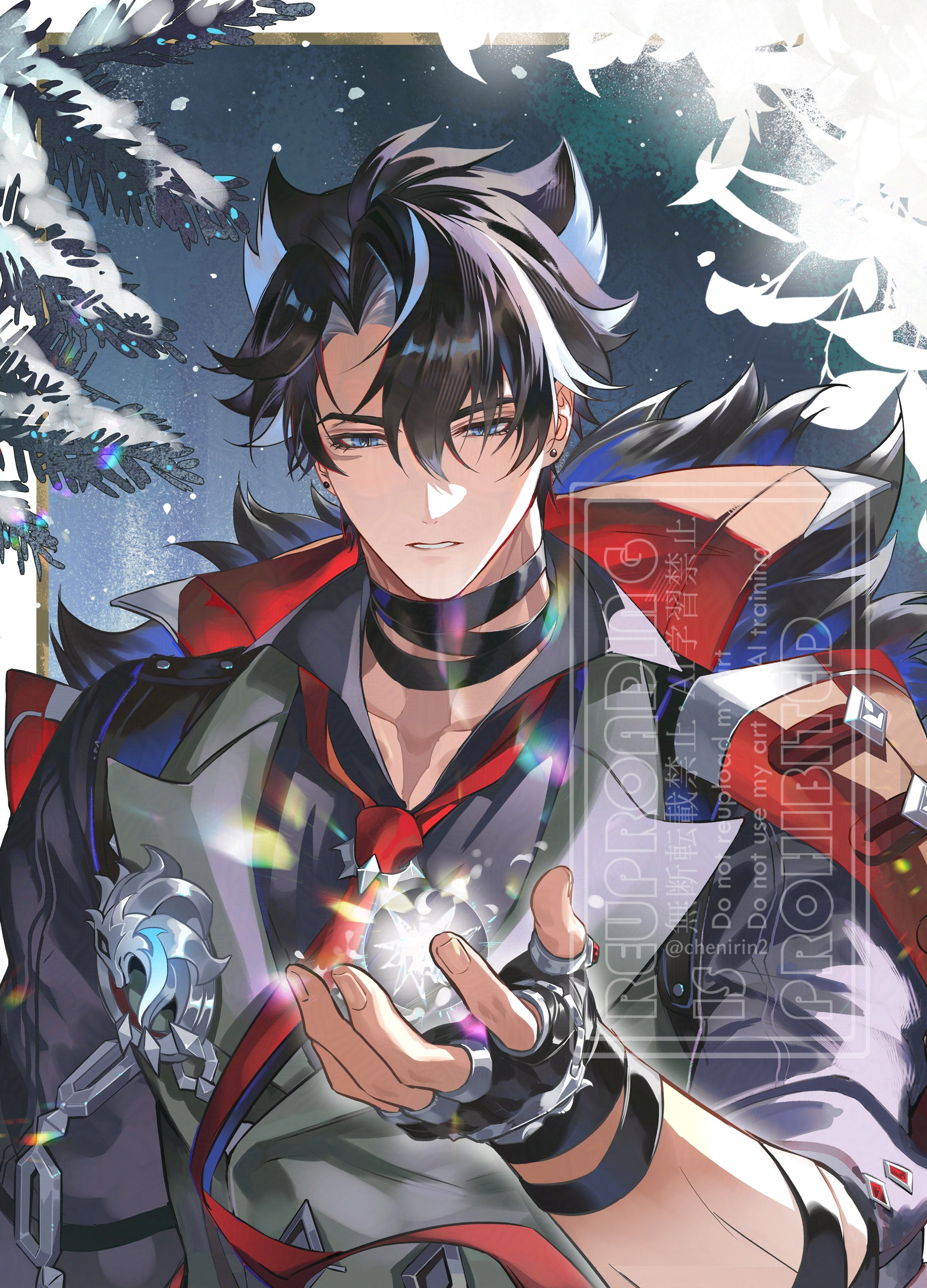 1boy absurdres artist_name bandaged_arm bandaged_neck bandages black_gloves black_hair black_shirt blue_eyes branch buttons chain collared_shirt commentary_request double-breasted earrings facial_scar fingerless_gloves genshin_impact gloves grey_hair grey_vest hair_between_eyes hand_up highres jewelry lapels lens_flare looking_down male_focus multicolored_hair necktie orb parted_bangs parted_lips red_necktie rin_(chenirin2) scar scar_on_cheek scar_on_face scar_on_neck shirt short_hair short_sleeves snow snowing solo streaked_hair stud_earrings twitter_username upper_body vest wriothesley_(genshin_impact)