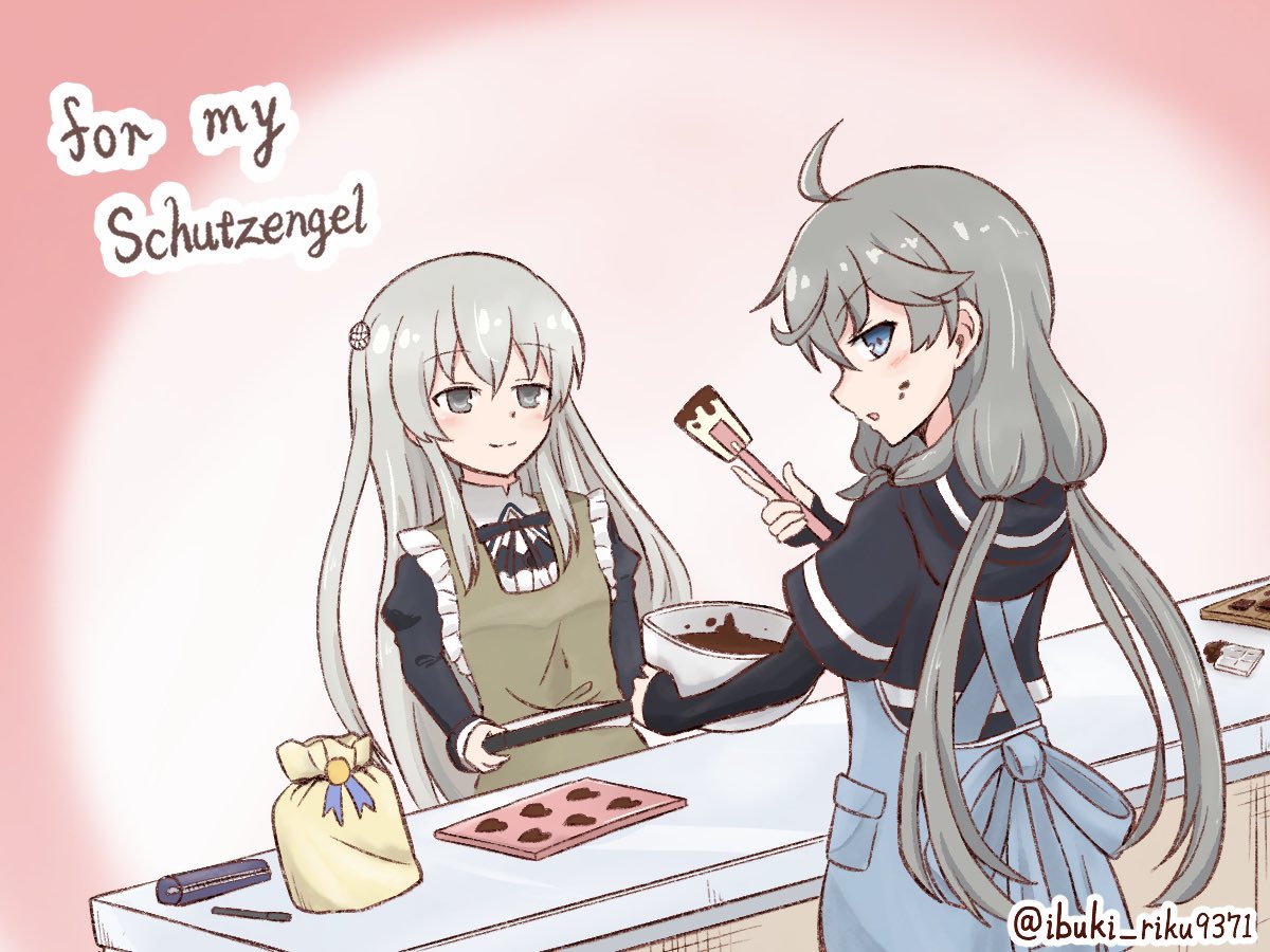 2girls ahoge apron assault_lily baking_sheet black_ribbon blue_apron blush bowl brown_apron candy chocolate chocolate_bar chocolate_making chocolate_on_face closed_mouth commentary_request counter cowboy_shot cropped_jacket egawa_kusumi food food_on_face frilled_apron frills gift_bag gradient_background grey_eyes grey_hair hair_between_eyes hands_up holding holding_bowl holding_spatula holding_tray hood hood_down ibuki_riku juliet_sleeves kanabako_misora layered_sleeves long_hair long_sleeves looking_at_another looking_at_viewer looking_to_the_side low_twintails mixing_bowl multiple_girls neck_ribbon pink_background profile puffy_sleeves ribbon school_uniform short_sleeves sidelocks sideways_glance spatula standing tray twintails twitter_username very_long_hair yurigaoka_girls_academy_school_uniform