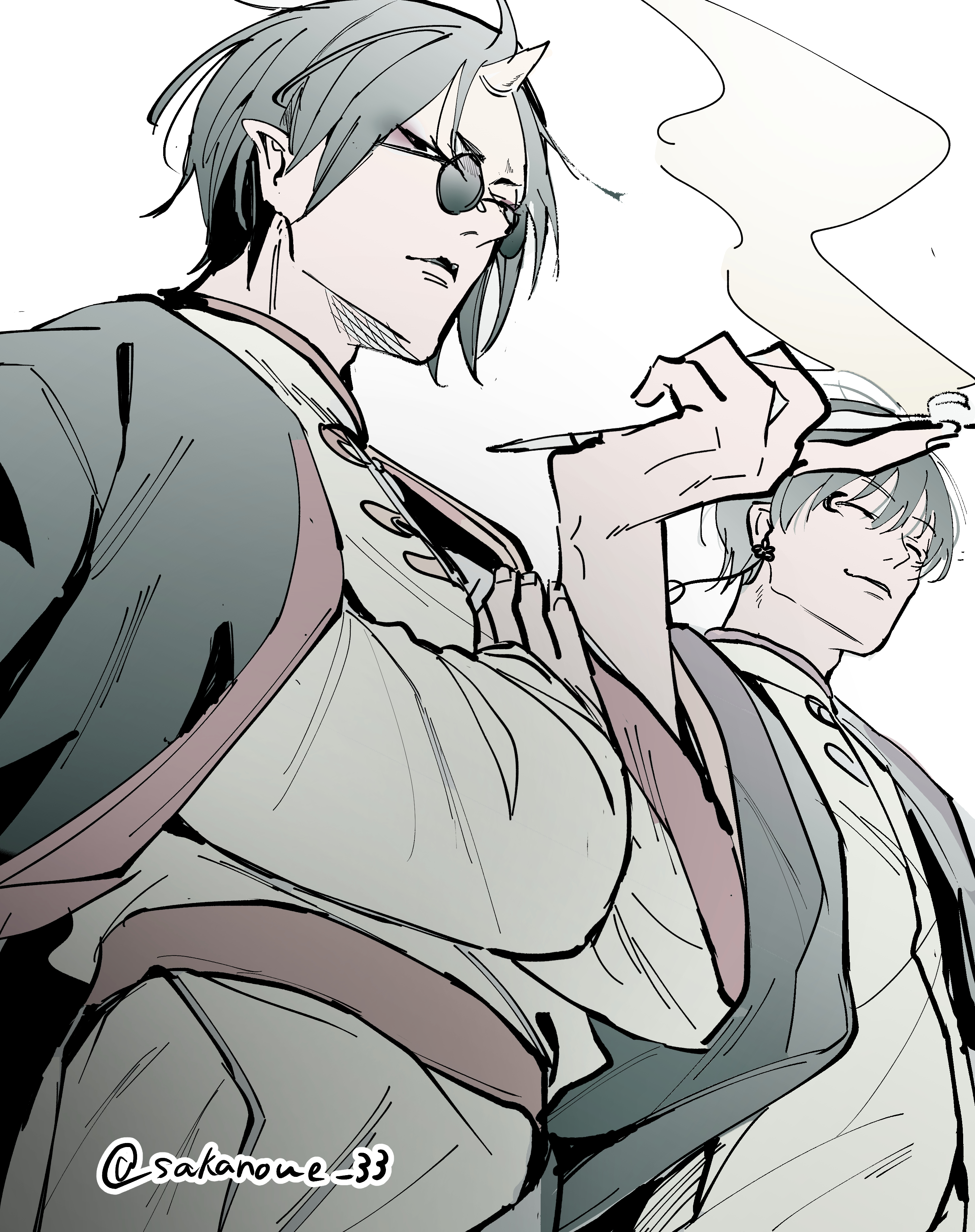 2boys absurdres black_hair black_kimono chinese_clothes hakutaku_(hoozuki_no_reitetsu) highres hoozuki_(hoozuki_no_reitetsu) hoozuki_no_reitetsu horns japanese_clothes kimono looking_at_viewer male_focus multiple_boys sakanoue_33 sinobu_33