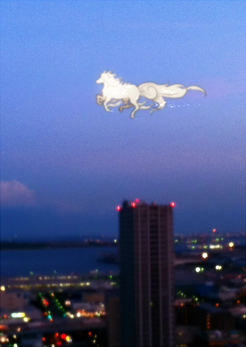 animalization bai_ze_(mythology) building city city_lights flying hakutaku_(hoozuki_no_reitetsu) hoozuki_no_reitetsu outdoors rudorufu11 sky twilight