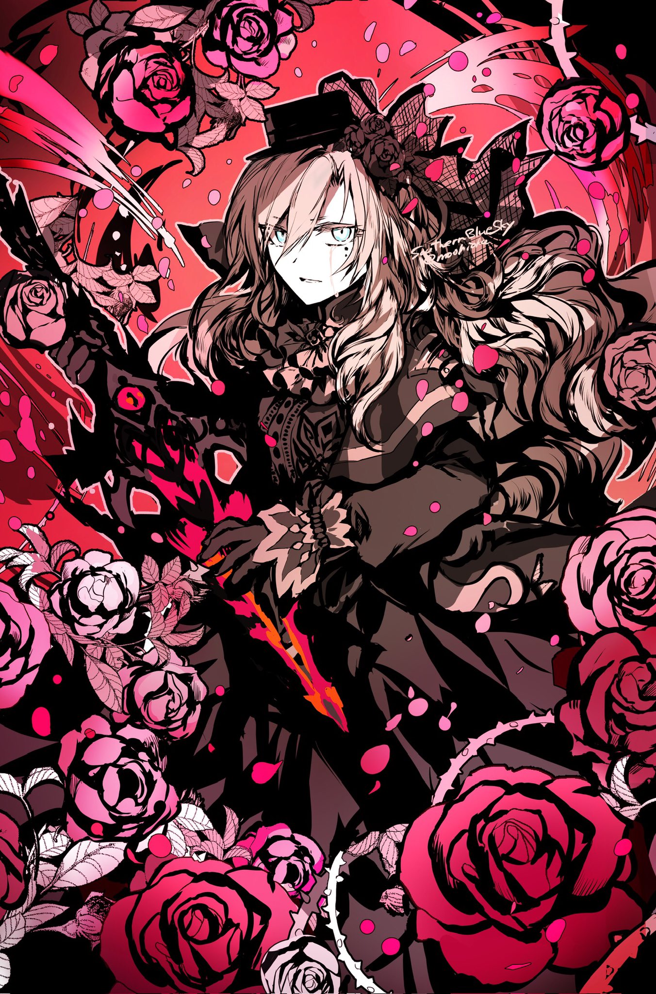 1girl balmung_kriemhild_(fate) black_dress black_hat blue_eyes crying crying_with_eyes_open dress fate/grand_order fate_(series) flower grey_hair hat highres kriemhild_(fate) kriemhild_(first_ascension)_(fate) long_hair looking_at_viewer plant red_flower red_rose rioka_(southern_blue_sky) rose solo tears thorns vines