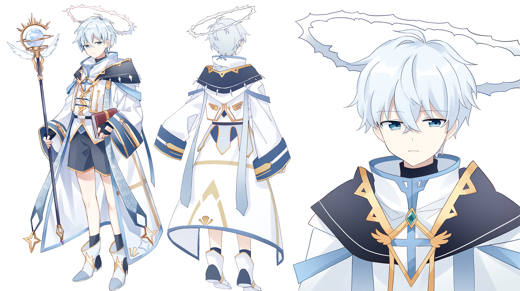 1boy balder_(eternal_senia) blue_eyes blue_hair book boots eternal_senia eternal_senia_2:hydrangea_after_the_rain expressionless halo highres holding holding_book jacket mage_staff male_focus open_clothes open_jacket short_hair shorts staff
