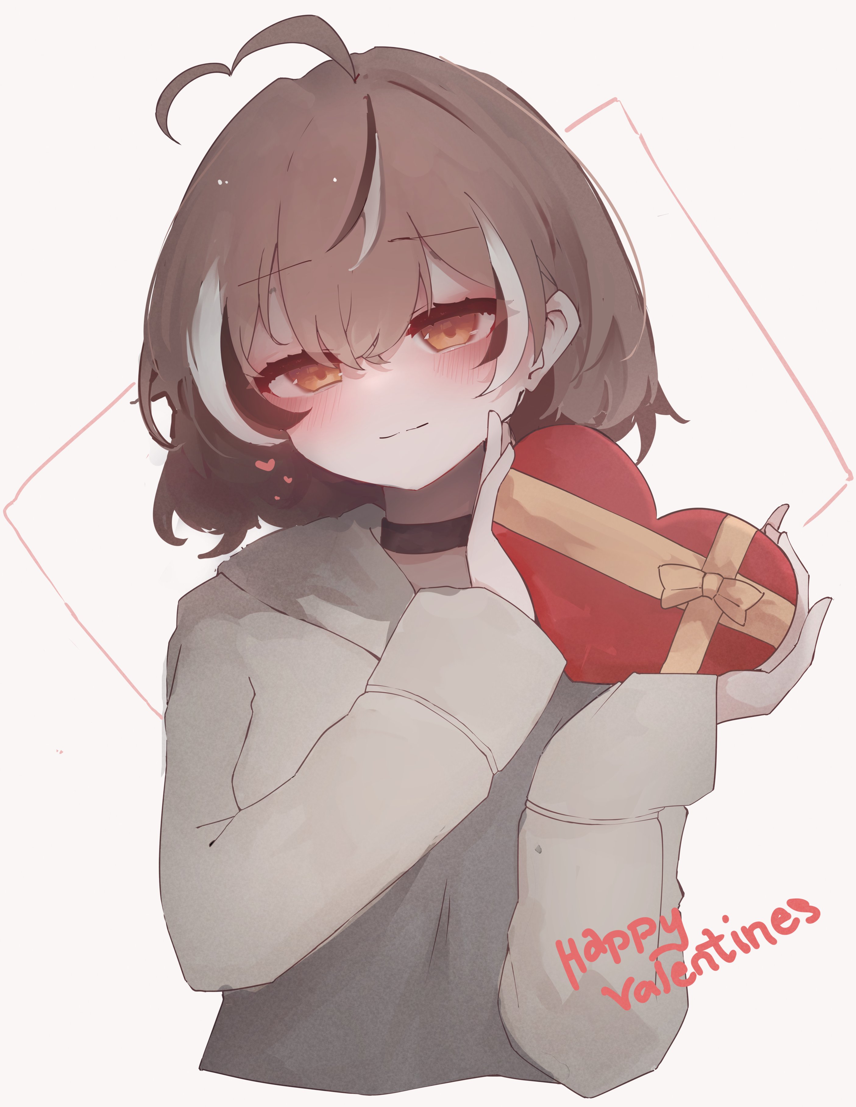 1girl absurdres ahoge black_choker blush brown_eyes brown_hair brown_hoodie choker gift happy_valentine heart heart_ahoge highres holding holding_gift hololive hololive_english hood hoodie looking_at_viewer multicolored_hair nanashi_mumei nanashi_mumei_(casual) short_hair simple_background smile streaked_hair ty4nak upper_body valentine virtual_youtuber wide_sleeves