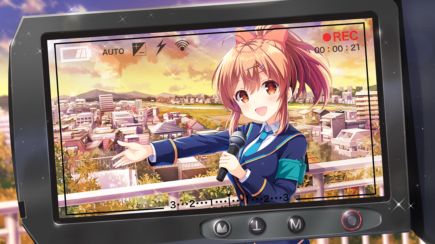2girls :d black_socks blazer blouse blue_jacket blue_necktie blue_skirt bow brown_eyes brown_hair camcorder girlfriend_(kari) hair_ornament jacket kneehighs layered_sleeves looking_at_another microphone multiple_girls necktie official_art open_mouth outdoors plaid_clothes plaid_skirt pleated_skirt ponytail qp:flapper sakurai_akane_(girlfriend_(kari)) school_uniform shirt skirt smile socks sunset video_camera white_shirt