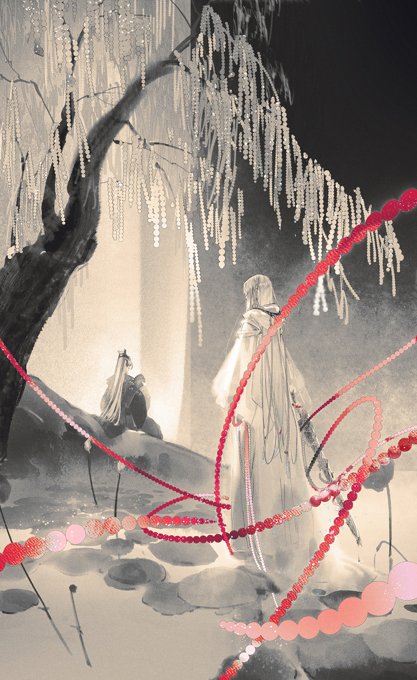 11zhigui 2boys beads braid chinese_clothes facing_another from_behind full_body greyscale hanfu highres holding holding_sword holding_weapon jinguang_budaixi long_hair long_sleeves male_focus mo_cangli monochrome multiple_boys qiao_rulai side_braid sidelighting sitting spot_color standing sword tree veil water weapon wide_sleeves xiao_guan_(headdress)