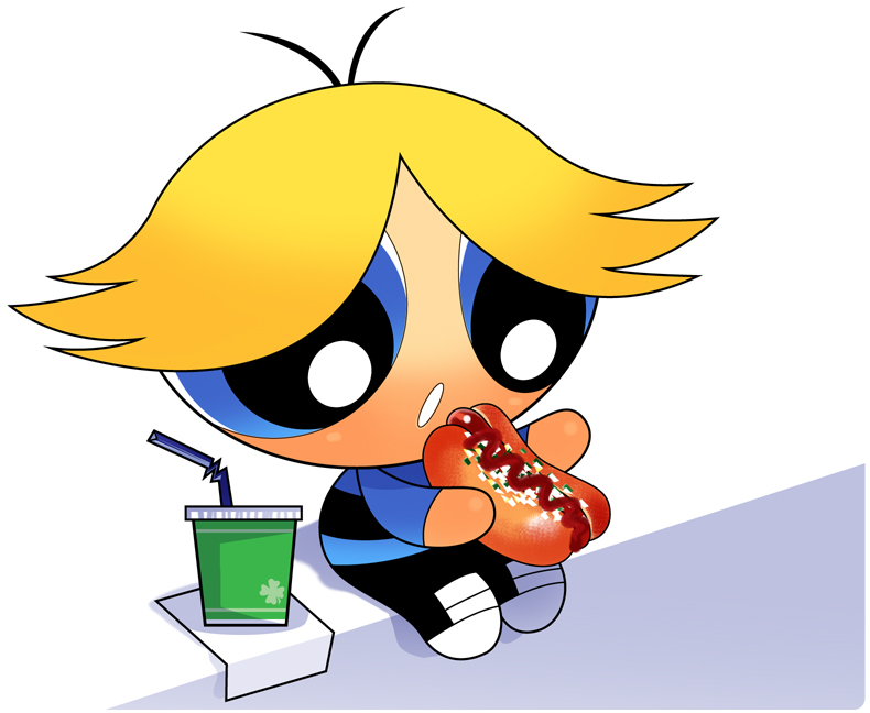 1boy antenna_hair black_pants black_shoes blonde_hair blue_eyes blue_shirt boomer_(ppg) child commentary cup disposable_cup hot_dog ketchup looking_at_food male_focus napkin on_ground open_mouth pants parted_bangs powerpuff_girls rowdyruff_boys shirt shoes sitting sneakers solo solo_focus striped_clothes striped_shirt white_background yunomi_(bearleaf)