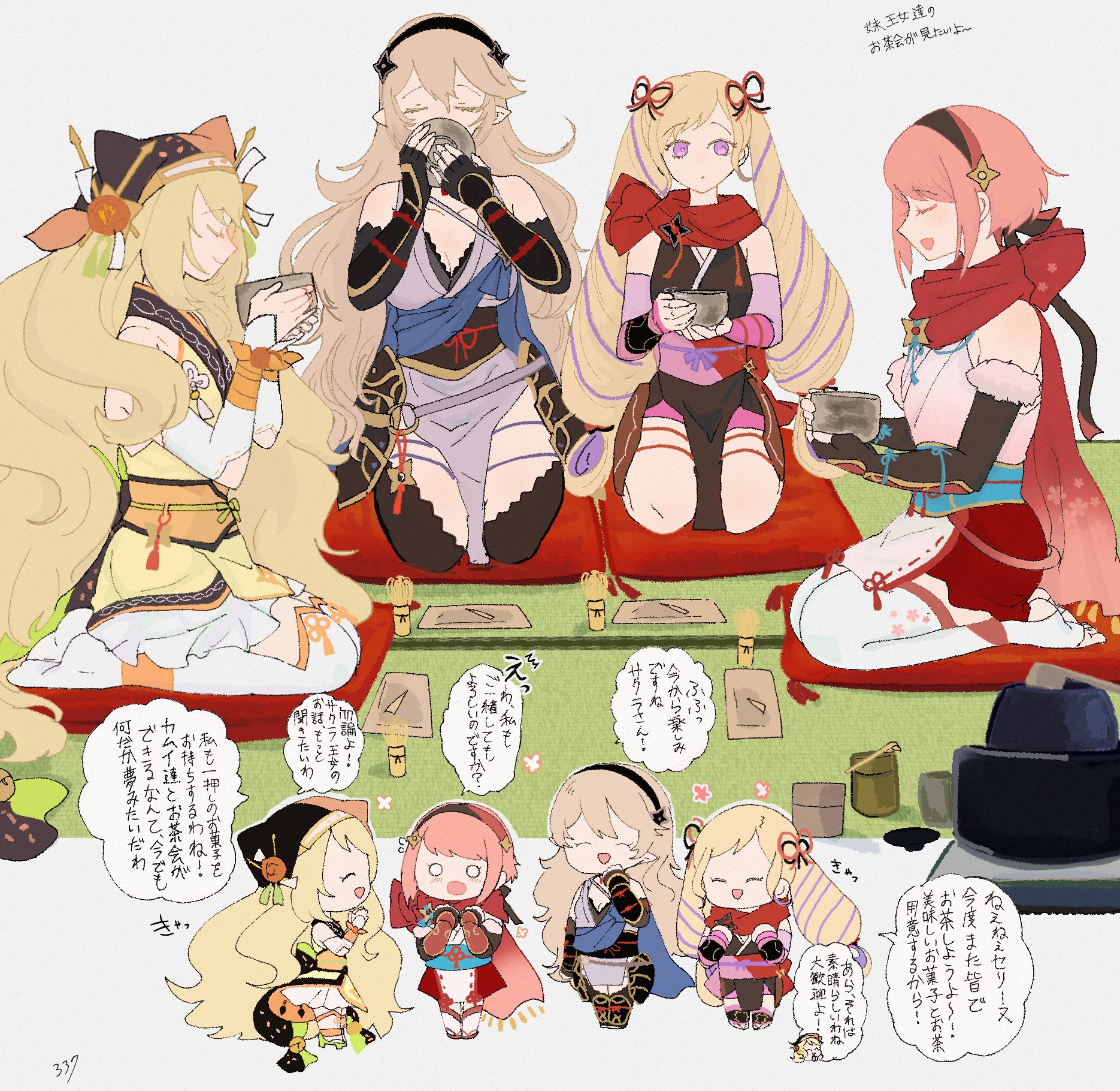 4girls :o alternate_costume bandana bare_shoulders black_hairband blonde_hair bowl celine_(fire_emblem) celine_(ninja)_(fire_emblem) chibi closed_eyes closed_mouth female_corrin_(fire_emblem) female_corrin_(ninja)_(fire_emblem) detached_sleeves drill_hair elise_(fire_emblem) elise_(ninja)_(fire_emblem) fire_emblem fire_emblem_engage fire_emblem_fates fire_emblem_heroes grey_hair hair_between_eyes hairband highres holding holding_bowl japanese_clothes long_hair looking_at_another multicolored_hair multiple_girls multiple_views ninja nintendo official_alternate_hairstyle open_mouth parted_lips pelvic_curtain pink_hair purple_eyes purple_hair red_scarf sakura_(fire_emblem) sasaki_(dkenpisss) scarf seiza short_hair sitting skirt speech_bubble thighhighs translation_request twin_drills two-tone_hair very_long_hair white_skirt white_thighhighs