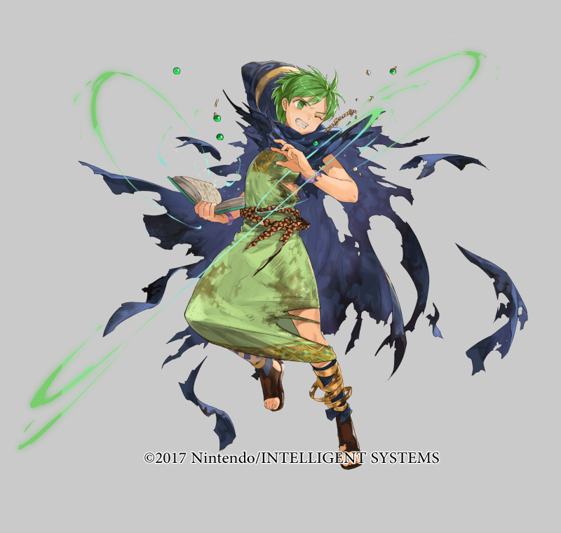1boy belt book bracelet cape copyright_notice fire_emblem fire_emblem:_mystery_of_the_emblem fire_emblem_heroes full_body green_eyes green_hair grey_background hood jewelry leaf male_focus mayo_(becky2006) merric_(changing_winds)_(fire_emblem) merric_(fire_emblem) nintendo official_art one_eye_closed sandals solo teeth torn_clothes wizard